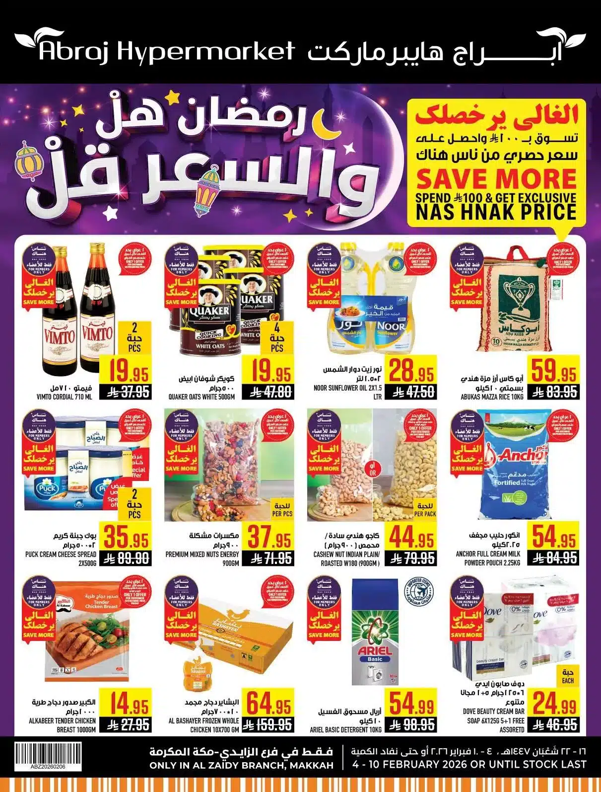 عروض ابراج هايبر ماركت الاسبوعية الاربعاء 4 فبراير 2026 الموافق 16-8-1447هـ و تحتوي علي عصير فانتا وعلب نستله ميلك وعلب كوكاكولا كولا وأرز بسمتي ولبن أنشري فريش وشوفان أنشري ودجاج مجمد وأرز أبيض وكريمة طبخ وأرز أصفر وفول مدمس ولوبيا ولحم بقري مجمد وتونة وفول سوداني ولبن أنشري وخليط كريمة باسعار مميزة