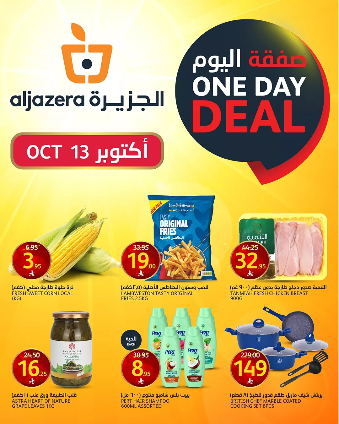 عروض أسواق الجزيرة اليوم الاثنين 13-10-2025 تقدم مجموعة مختارة من المنتجات الطازجة والمميزة و تشمل الذرة المحلية الطازجة وشرائح صدور دجاج طازجة بالإضافة إلى منتجات البطاطس الشهية وورق العنب الطبيعي و تتميز أيضا بتقديم منتجات العناية الشخصية مثل شامبو بيرت بأنواعه المتعددة باقل الاسعار