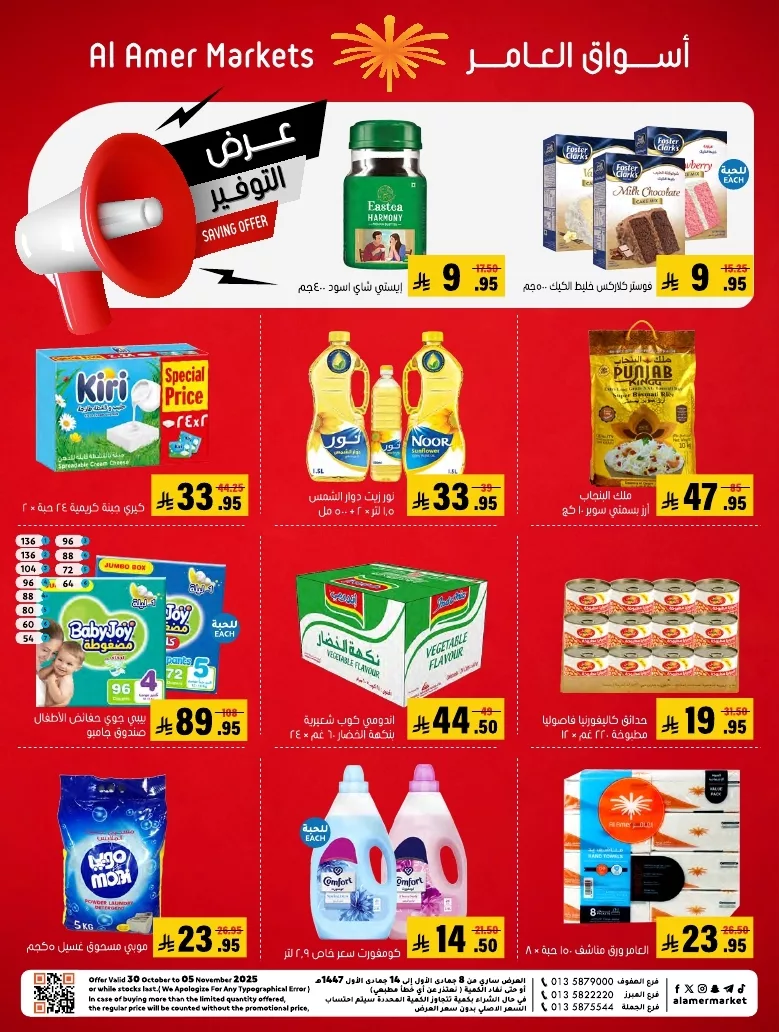 عروض أسواق العامر السعودية السبت 1-11-2025 و تحتوي علي المنتجات الغذائية والاستهلاكية منها الشاي والبسكويت والزيوت النباتية بالإضافة إلى الأجبان المميزة والخضروات وحفاضات الأطفال كما تتوفر المواد المنزلية مثل المناديل الورقية والمنظفات وأطقم العصائر بتوفر الأجبان و الخبز والمعجنات باقل الاسعار