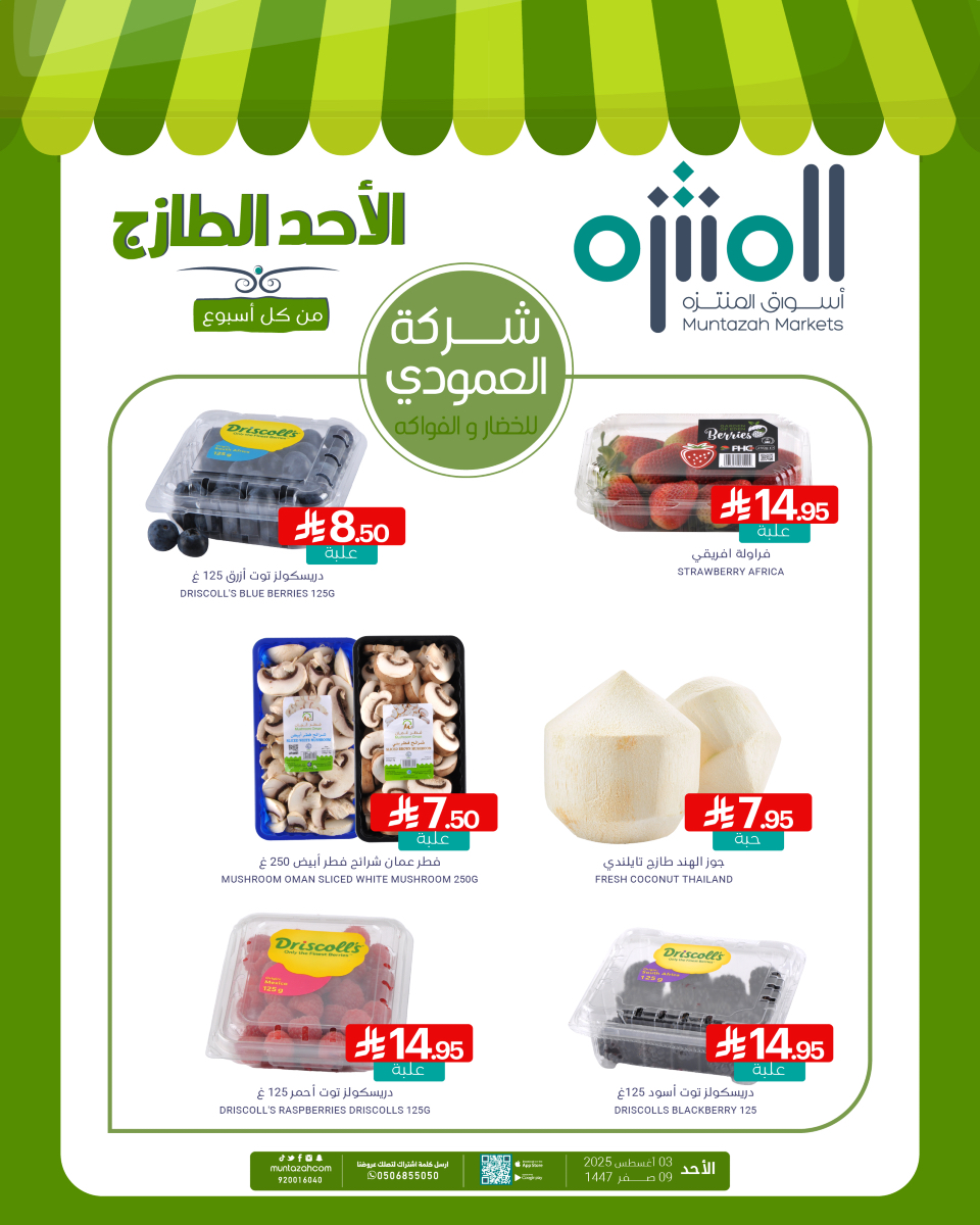 روض أسواق المنتزه الأحد 3 أغسطس 2025 تقدم باقة مميزة من أجود أنواع الفواكه والخضروات الطازجة بالتعاون مع شركة العمودي حيث تشمل تشكيلة متنوعة من التوت الطازج إضافة إلى الفراولة الأفريقية الشهية وجوز الهند التايلندي الطازج و تفاح بينك ليدي وتفاح جالا أو الأحمر أو الأخضر الفرنسي وباقل الاسعار