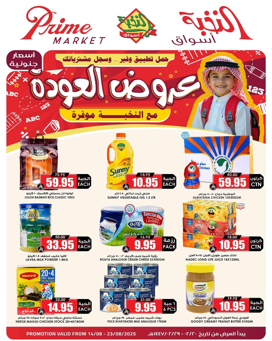 عروض أسواق النخبة الخميس 14 أغسطس 2025 تقدم تشكيلة واسعة من المنتجات الغذائية الأساسية من الأرز البسمتي والزيت النباتي والدجاج المجمد إلى الحليب المجفف والجبن الكريمي والعصائر المتنوعة و تشمل أيضا خضروات وفواكه طازجة بأسعار تنافسية مثل الموز والتفاح والبصل والثوم إلى جانب اللحوم الطازجة والدواجن