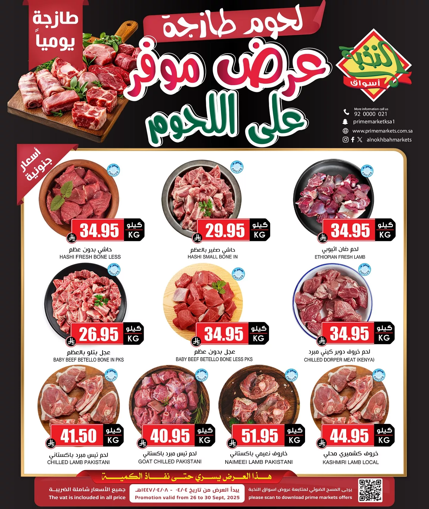 عروض اللحوم الطازجة في أسواق النخبة الأحد 28 سبتمبر 2025 تشمل عروض اليوم علي اللحم الطازج الهايشي ولحم الضأن الإثيوبي ولحم البيف الباكستاني بالإضافة إلى الخيارات المتخصصة مثل لحم الضأن الكشميري المحلي واللحم المدغوم الكيني و يتوفر ايضا لحم الضأن النعيمي الباكستاني ولحم الماعز المبرد ولحم العجل البتللو بالعظم وبدون