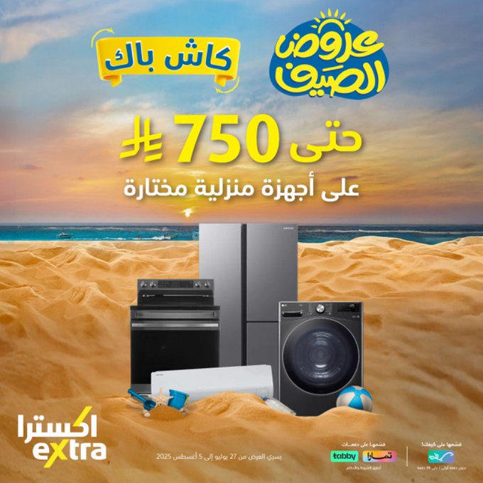 عرض اكسترا السعودية مستمره حتى 5 أغسطس 2025 و احصل على كاش باك حتى 750 ريال على أجهزة منزلية مختارة تسوق الان و استفد من العرض قسم فاتورتك على كيفك بدون دفعة أولى أو قسمها مع تمارا و تابي هذه العروض حصرية في موقعنا لا تفوتوها.