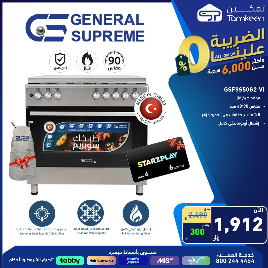 من أهم عروض تمكين الحالية على الأجهزة المنزلية، موقد غاز فاخر من جنرال سوبريم، يجمع بين الفخامة والأداء المثالي للمطابخ العصرية