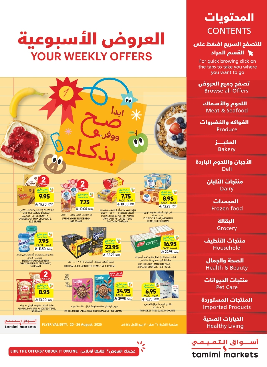 عروض التميمي الأسبوعية الأربعاء 26 صفر 1447هـ تقدم منتجات غذائية متنوعة تشمل الزيوت الطبيعية مثل زيت بذور الكتان وزيت السمسم والعسل العضوي والمربى بنكهات التوت والفواكه الطازجة مثل البرتقال والتفاح والكمثرى بالإضافة إلى الأجهزة المنزلية التي تضم صانعات الآيس كريم وآلات صنع الوافل والغلايات الفولاذية وأجهزة تحضير القهوة الكبسولية
