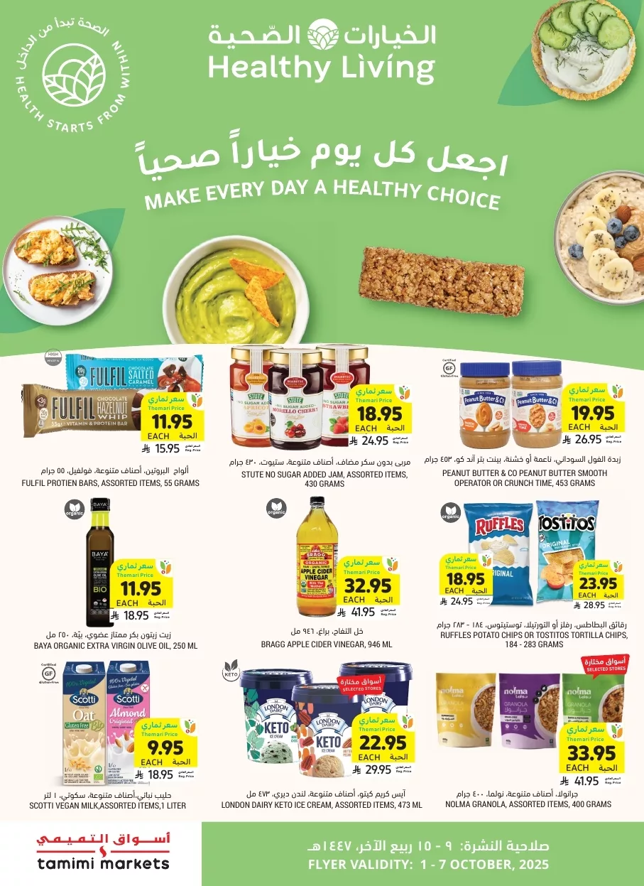 عروض التميمي الرياض الأسبوعية الأربعاء 1 أكتوبر 2025 تقدم خصومات على المخبوزات الطازجة وزيت الزيتون والعسل الطبيعي و منتجات الألبان والخضروات كالخيار والبطاطا الحلوة والبصل الأبيض والفواكه كالكمثرى والتفاح الأخضر والفراولة كما تشمل أجهزة تحضير القهوة التركية وأجهزة القلايات الهوائية وأطقم الطهي السيراميك