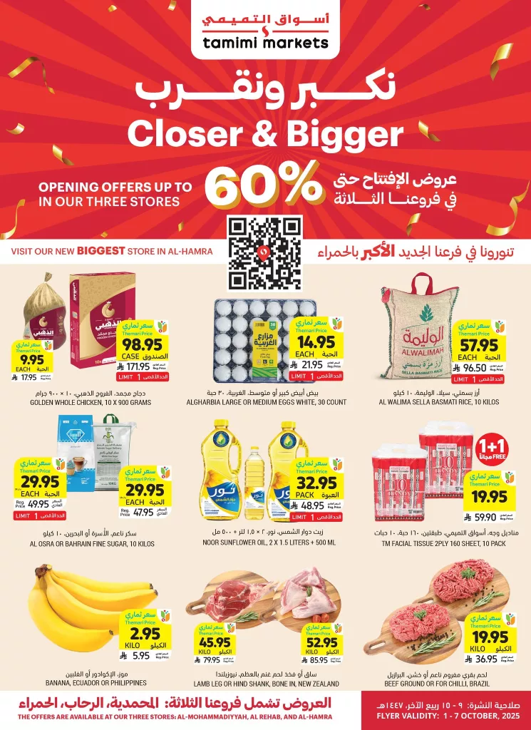 عروض التميمي حتي الثلاثاء 7 أكتوبر 2025 تأتي بمجموعة من المنتجات الطازجة المختارة تشمل الدجاج الكامل والبيض والأرز البسمتي والسكر وزيت دوار الشمس والموز الطازج ولحم الغنم ولحم العجل و تضم ايضا أواني الطهي وأدوات التخزين البلاستيكية ومنتجات العناية الشخصية كمناديل الوجه باقل الاسعار المناسبة للجميع