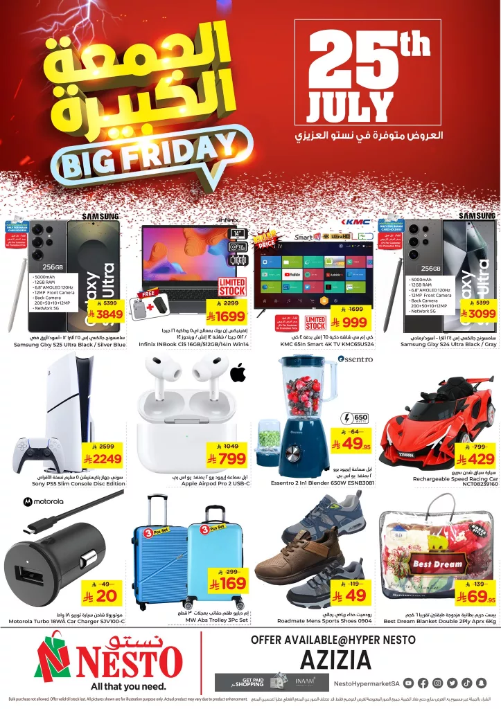 عروض الجمعة الكبيرة Big Friday من نستو هايبر ماركت فرع العزيزية بالرياض، والتي تنطلق يوم 25 يوليو بمجموعة من أقوى التخفيضات على الإلكترونيات والأجهزة المنزلية واحتياجات الأسرة.