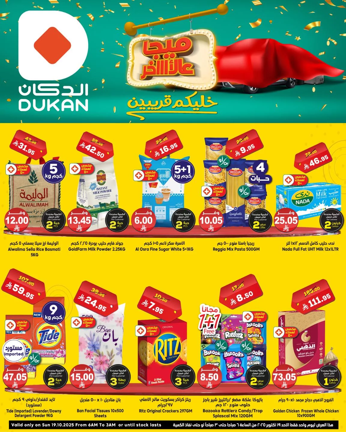 عروض الدكان جدة الأحد 19 أكتوبر 2025 تشمل أرز الوليمة الشهير وحليب جولد فارم الباودر بالإضافة إلى تشكيلة واسعة من المكرونة والسكر ومجموعة أجبان ومنتجات الحليب الطازج و بتوفر كمان منتجات اللحوم والدواجن المجمدة باسعار مناسبة و العرض متاح اليوم فقط انتهز الفرصة و اشتر الان .