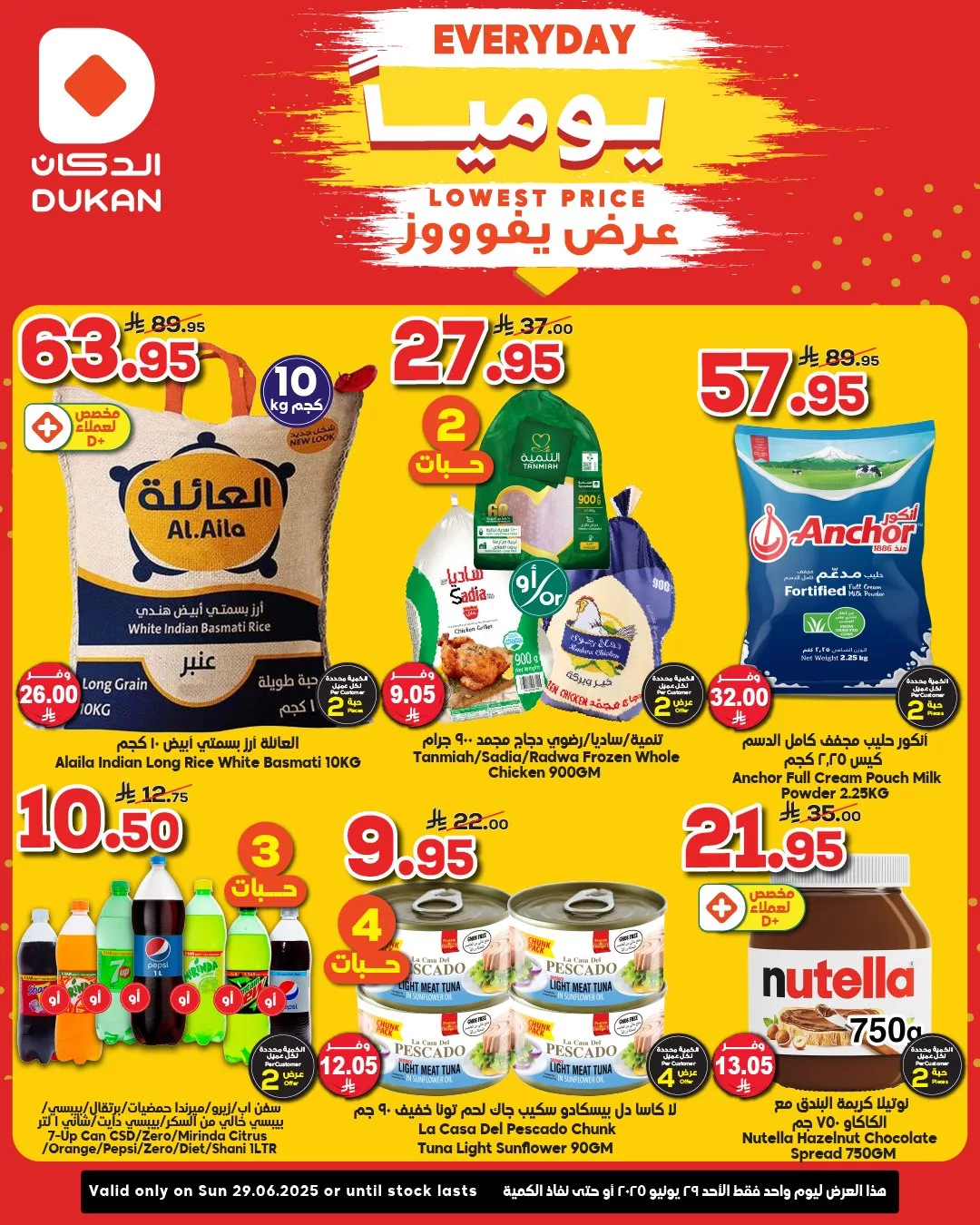 عروض الدكان جدة الاحد 29 يونيو 2025 تقدم لك باقة مختارة من المنتجات الأساسية بجودة عالية وتوفير حقيقي حيث تجد أرز بسمتي هندي أبيض من العائلة بوزن كبير يناسب الاستخدام اليومي ودجاج مجمد من أشهر العلامات مثل ساديا وتنمية وروابي لتلبية احتياجاتك من البروتين
