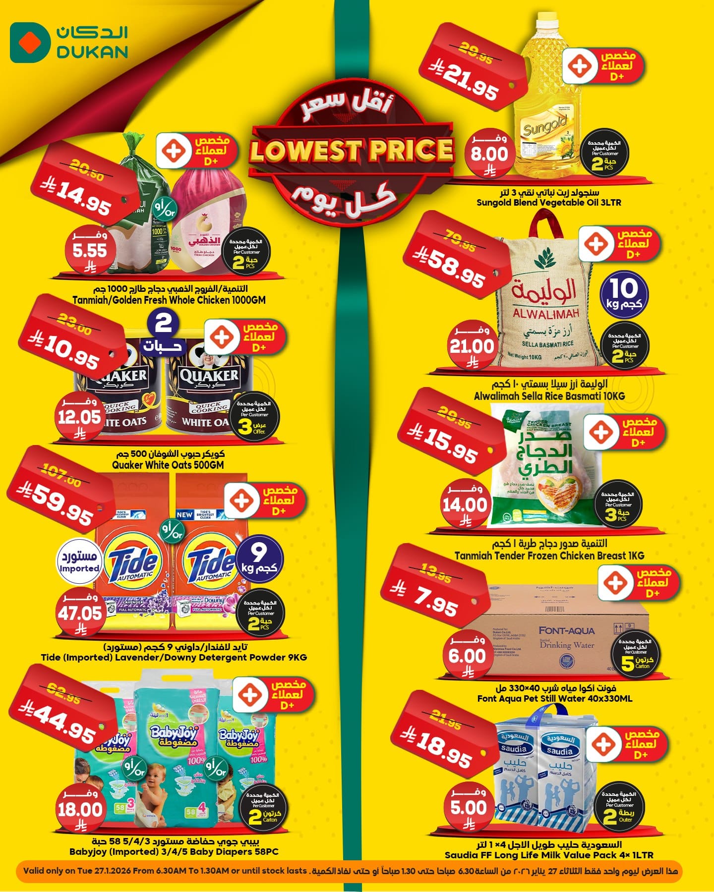 عروض الدكان جدة الثلاثاء 27-1-2026 الموافق 8 شعبان 1447هـ و تحتوي علي تشكيلة من المنتجات الغذائية و الاساسية منها دجاج التنمية و ارز الوليمة و مسحوق غسيل تايد و غيرها من المنتجات و باقل الاسعار المناسبة للجميع في صفقة حصرية متاحة اليوم فقط تابعونا ليصلكم كل جديد عن عروض السعودية .