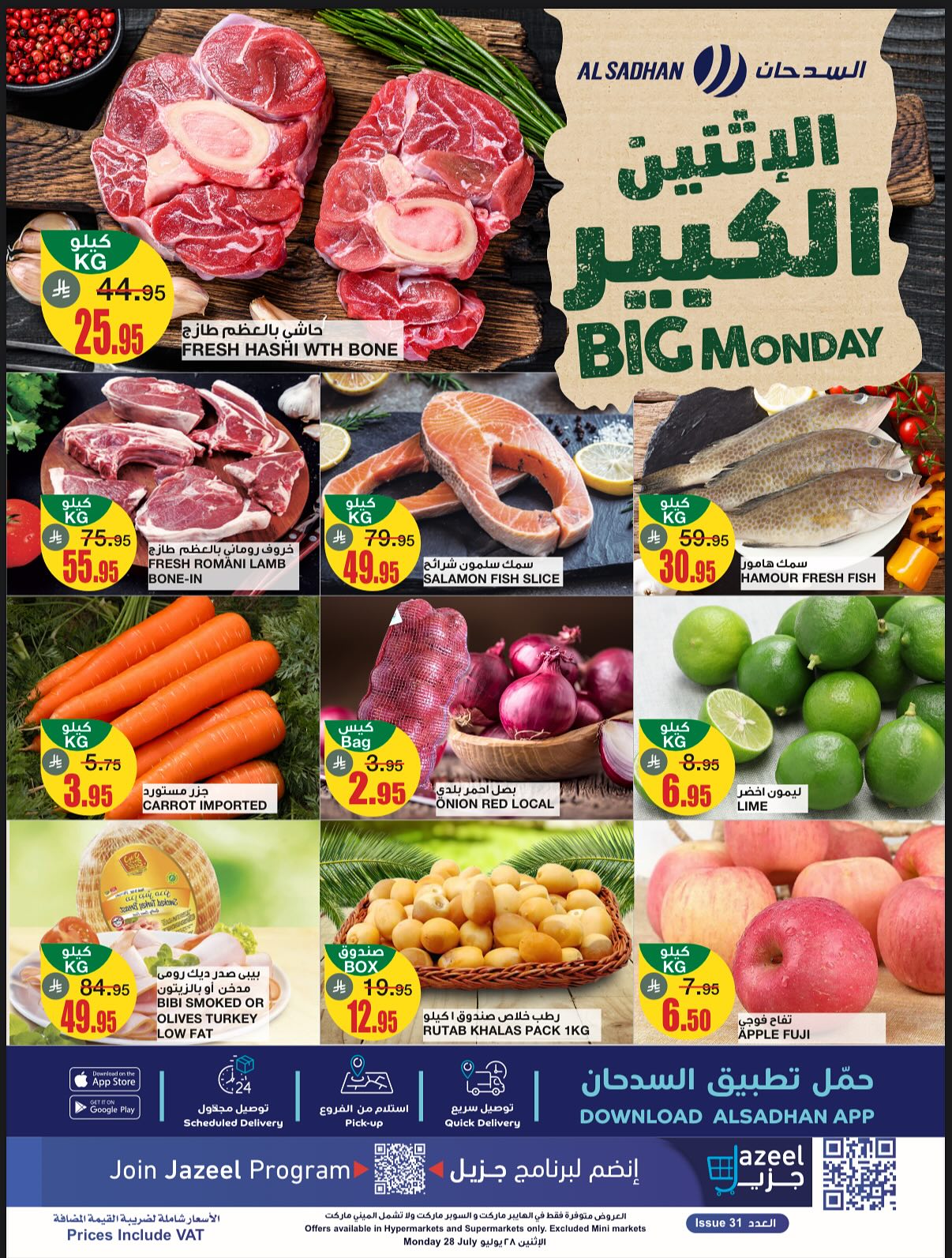 عروض السدحان الاثنين 28 يوليو 2025 تقدم مجموعة متنوعة من التخفيضات على اللحوم الطازجة والمأكولات البحرية حيث تشمل العرض لحم الحاشي بالعظم والخروف الروماني الطازج بالإضافة إلى شرائح السلمون وسمك الهامور الطازج و تشمل مواد غذائية أساسية مثل معجون الطماطم والفول المدمس والبيتزا المجمدة والكيك