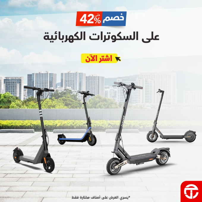 خصم يصل إلى 42% على السكوترات الكهربائية، ويشمل العرض موديلات مختارة فقط، مما يتيح لك فرصة اقتناء أحد أفضل أنواع السكوترات بسعر مميز مع الحفاظ على الجودة والكفاءة العالية