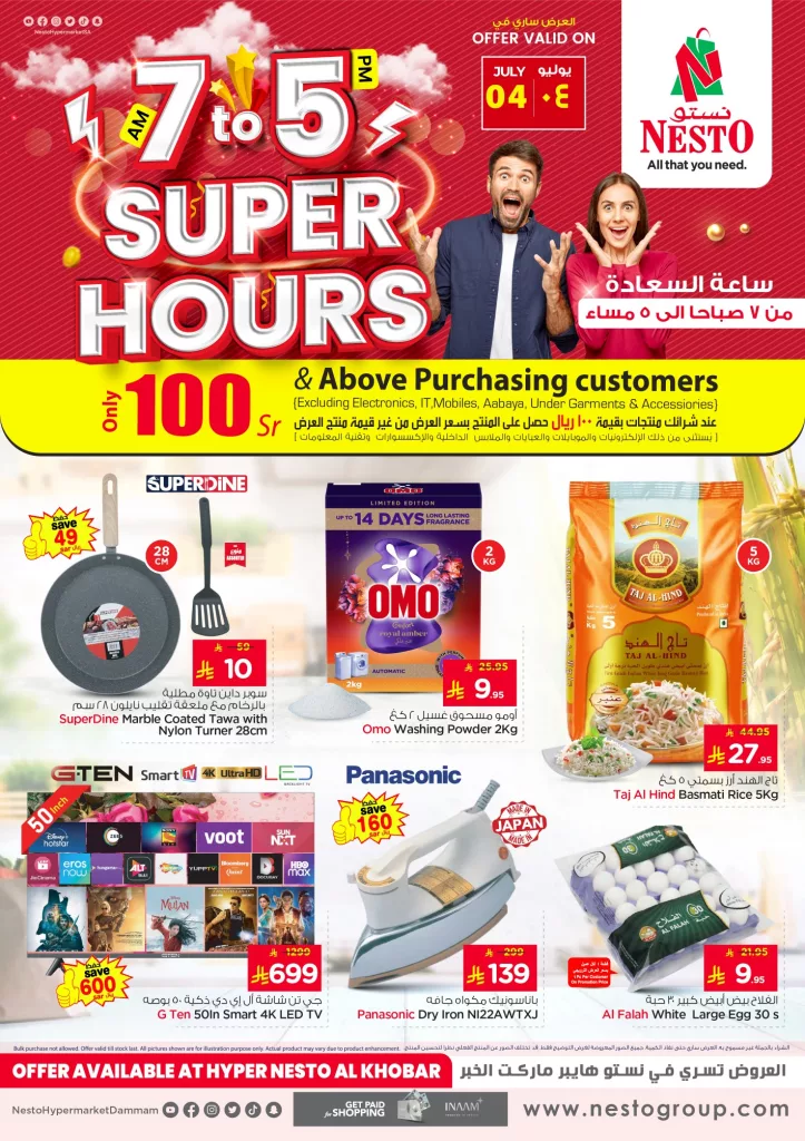 تشهد المملكة العربية السعودية منافسة قوية بين الهايبر ماركت في تقديم عروض استثنائية يومية لجذب المتسوقين، ومن أبرز هذه الفعاليات عرض “ساعة السعادة” المميز في نستو هايبر ماركت الخبر ليوم الخميس 4 يوليو 2025، والذي يوفر تخفيضات ضخمة من الساعة 7 صباحاً وحتى الساعة 5 مساءً فقط