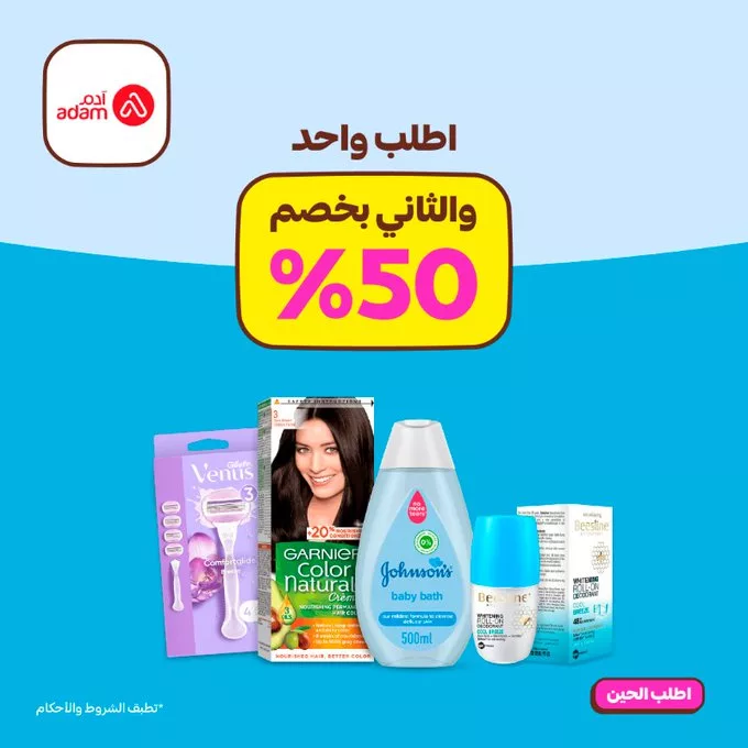 - يتم تطبيق الخصم بنسبة 50% على المنتج الثاني الأقل سعراً