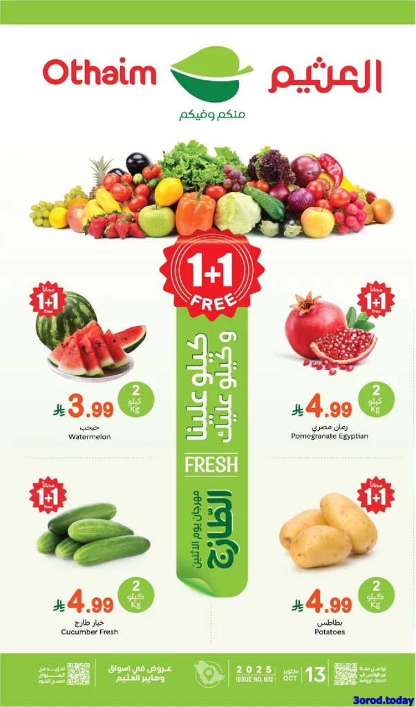 عروض العثيم الاثنين 13 أكتوبر 2025 تبدأ مع باقة مذهلة من المنتجات الطازجة والخضروات والفواكه وتشمل الفواكه والخضروات الطازجة والتوابل والمكسرات وحتى مستلزمات الطهي المتنوعة والجبن والمنتجات اللبنية وتتنوع لتشمل اللحوم والدواجن والعديد من الخيارات المفيدة مع حزمة من اللحوم الطازجة والجبن وأنواع الحلاوة والزيتون