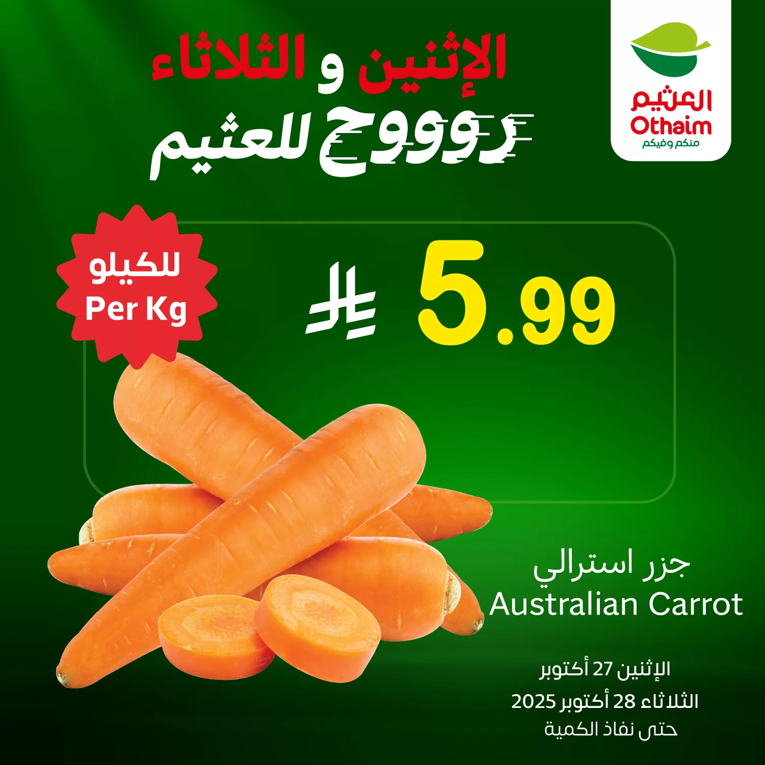 عروض العثيم الاثنين 5 جماد الاول 1447هـ تقدم مجموعة من الخضار والفواكه الطازجة منها الجزر الأسترالي والفلفل البارد الأخضر و بتوفر كمان تشكيلة الفواكه الموسمية مثل الكلمنتينا بالإضافة إلى عروض الخيار الطازج والبصل الأحمر و غيرها من المنتجات و باقل الاسعار المناسبة للجميع
