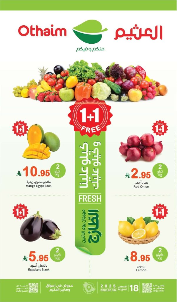 عروض العثيم الاثنين 18 اغسطس 2025 تقدم تشكيلة مميزة من الخضار والفواكه الطازجة تشمل المانجو والبصل الأحمر والباذنجان والليمون والعنب الأسود الكبير و تمتد لتشمل الأجبان بأنواعها واللحوم الطازجة والتمور الفاخرة في عروض العثيم اليوم تابعونا علي موقعكم عروض توداي لمعرفة كل جديد عن عروض السعودية .