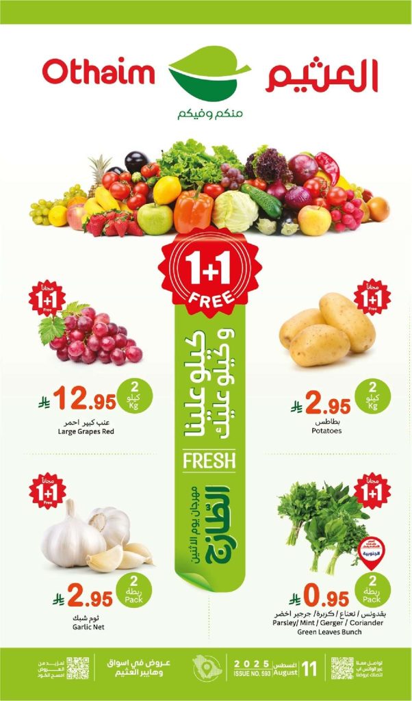 عروض العثيم الطازج الاثنين 11-8-2025 تقدم لكم تشكيلة واسعة من أجود أنواع الخضروات والفواكه الطازجة منها العنب الأحمر الكبير والبطاطس الطازجة والثوم الشبك وأوراق الخضار المتنوعة مثل البقدونس والنعناع والكزبرة تمتد عروض العثيم اليوم لتضم تشكيلة من اللحوم الطازجة مثل المفروم البقري المبرد ولحم التيس بالعظم ولحم الغنم