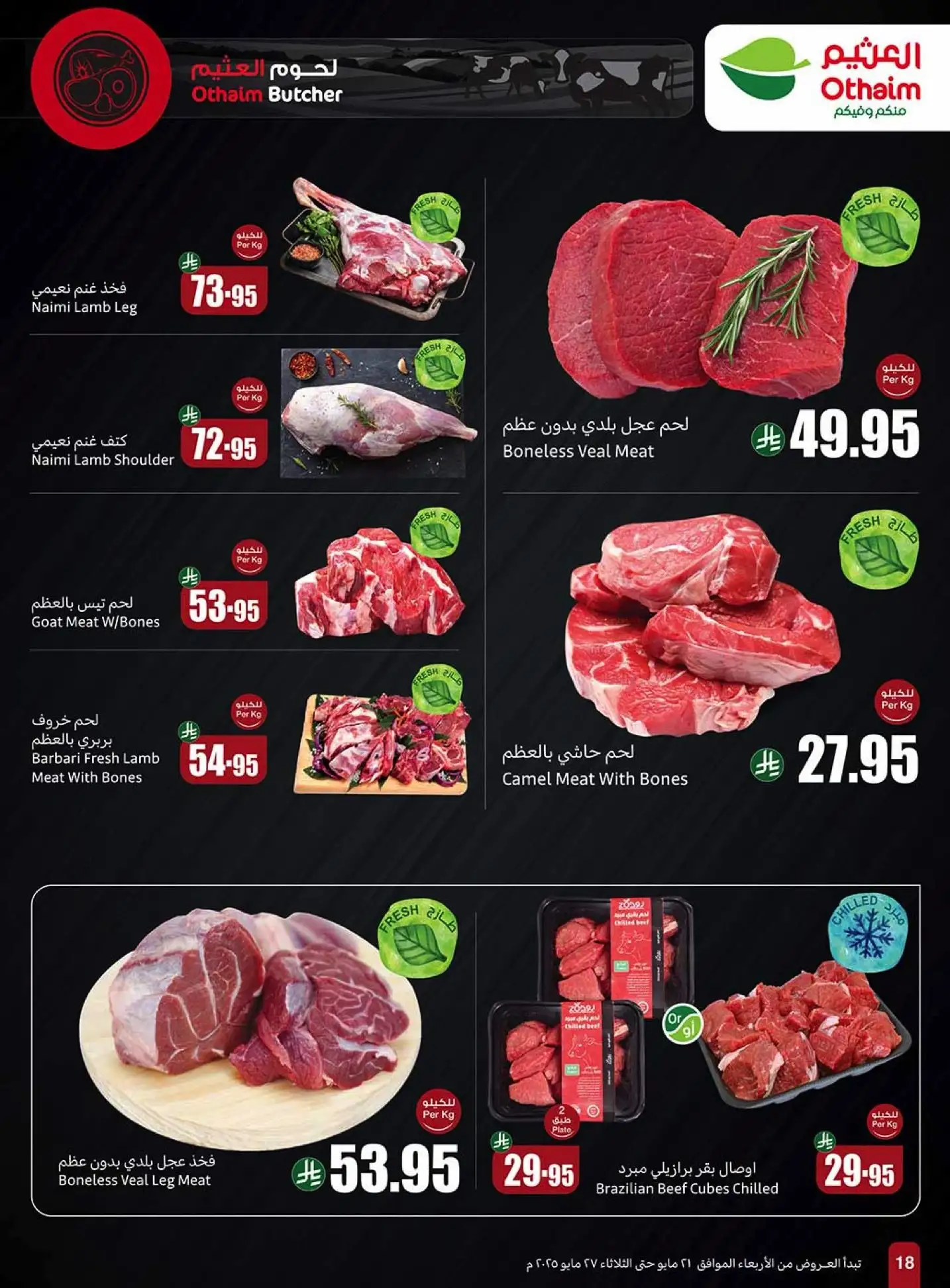 عروض العثيم اليوم تشمل أيضا قسم اللحوم الطازجة الذي يوفر لحوم غنم وعجل وجمال بمستويات عالية من الجودة والتقطيع المثالي يتميز العرض بتوافر خيارات متنوعة مثل الكتف والفخذ واللحم المفروم والعظم والبدون لتلبية كل وصفة ومتطلبات الطبخ العائلي باسعار تنافسية