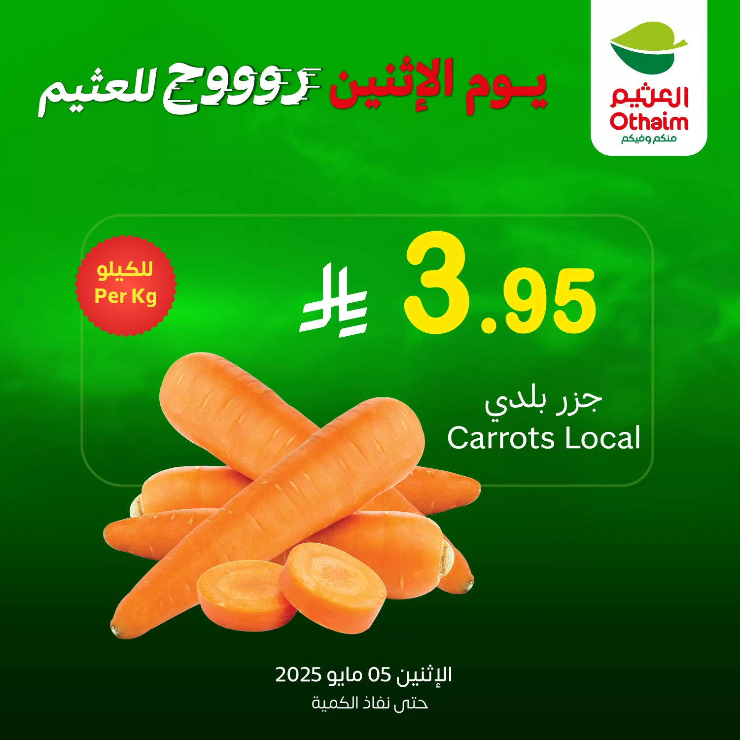 عروض العثيم الاثنين 5 مايو 2025 تقدم للعملاء تشكيلة مميزة من الخضروات والفواكه الطازجة بجودة عالية وعروض لا تُفوّت تناسب جميع الأذواق حيث تتوفر الجزر المحلي الطازج بمظهر شهي وطبيعي يجذب المتسوقين كما يشمل العرض بصل أحمر غني بالنكهة مع عرض 1+1 مجاناً