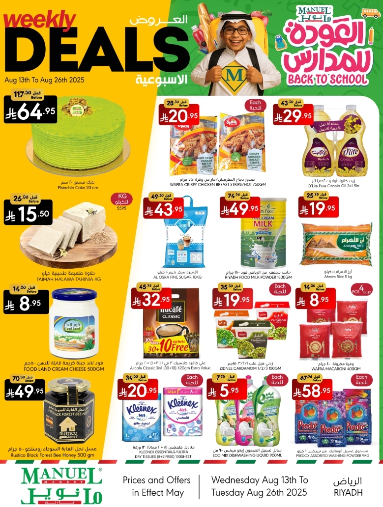 عروض مانويل الرياض الأسبوعية – تخفيضات العودة للمدارس الأربعاء 13 أغسطس 2025 تبدأ بعروض على الأجهزة المنزلية مثل أفران البيتزا المنزلية وصانعات الآيس كريم وخلاطات العجين الاحترافية والمكانس اللاسلكية والمراوح الذكية المزودة بتحكم عن بعد كما تشمل المنتجات الغذائية التمور الفاخرة المحشوة بالشوكولاتة والفواكه الاستوائية