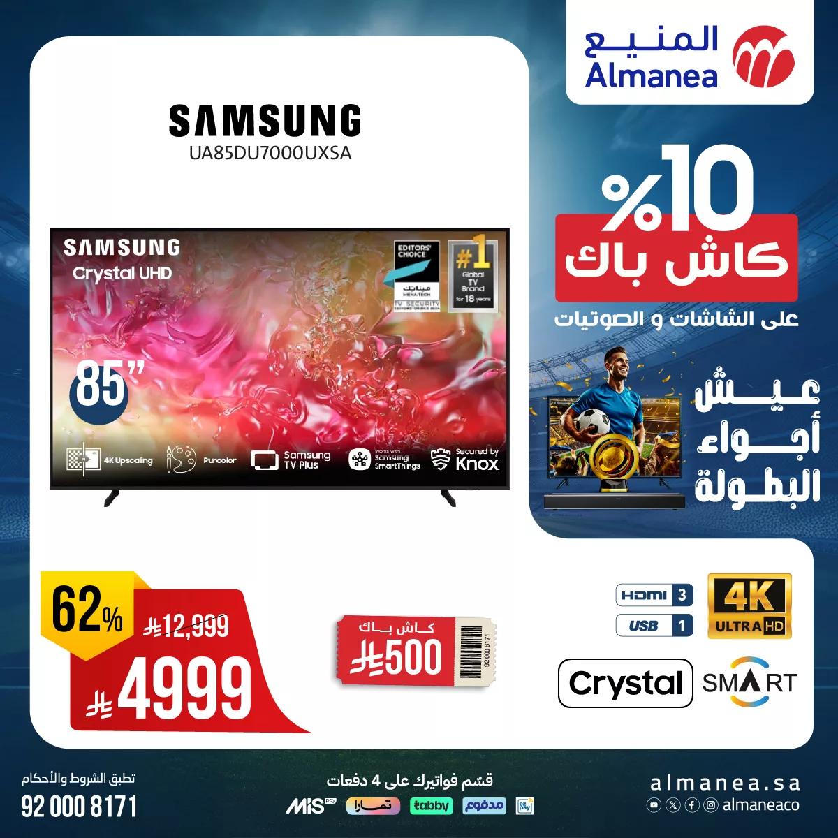 - تلفزيون سامسونج 85 بوصة Crystal UHD – 4999 ريال (بدلاً من 12,999 ريال)