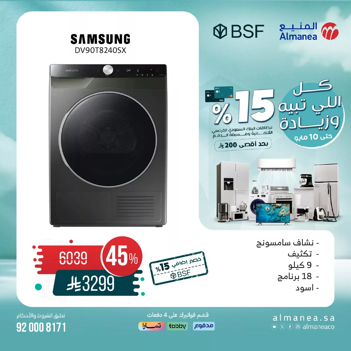 - نشّاف سامسونج 9 كيلو، 18 برنامج، أسود – 3299 ريال (بعد خصم 45٪)