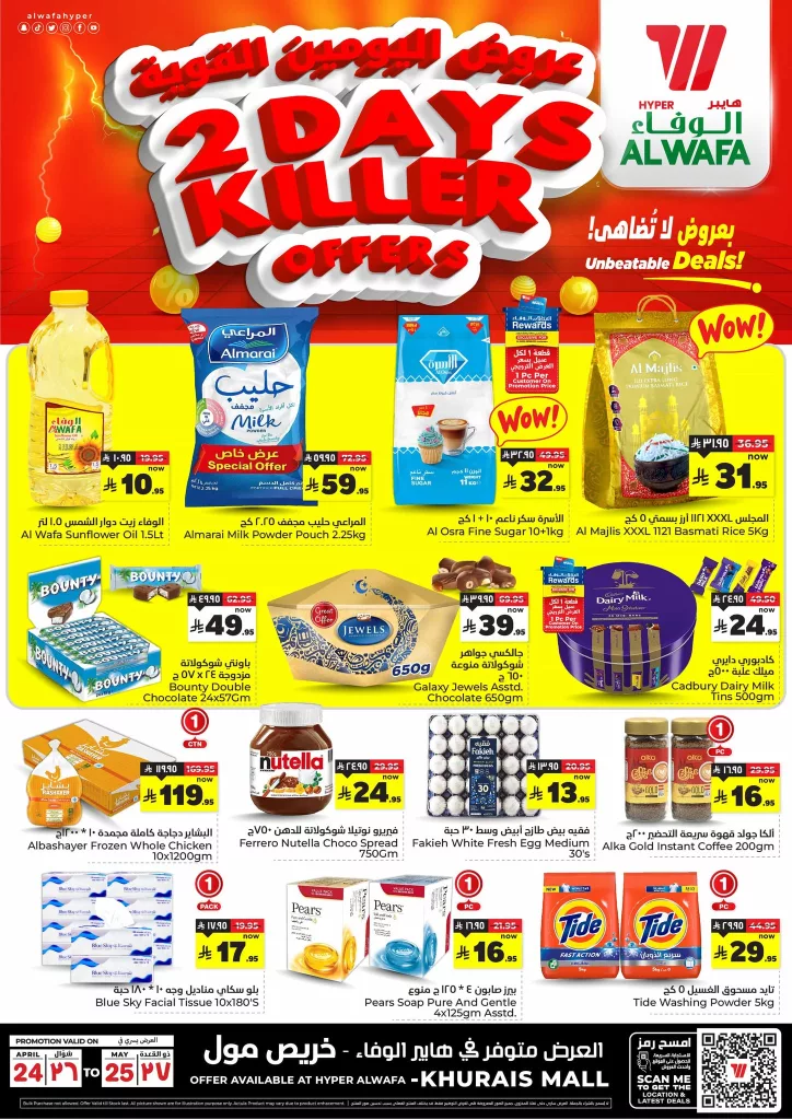 عروض الوفاء هايبر ماركت الخميس 24-4-2025 تقدم باقة مميزة من السلع الغذائية الأساسية التي يحتاجها كل بيت حيث شملت التخفيضات منتجات مثل الزيوت والحليب والسكر والأرز بأنواع فاخرة بالإضافة إلى تشكيلة متنوعة من الشوكولاتة الشهيرة مثل جلاكسي وكادبوري وباونتي