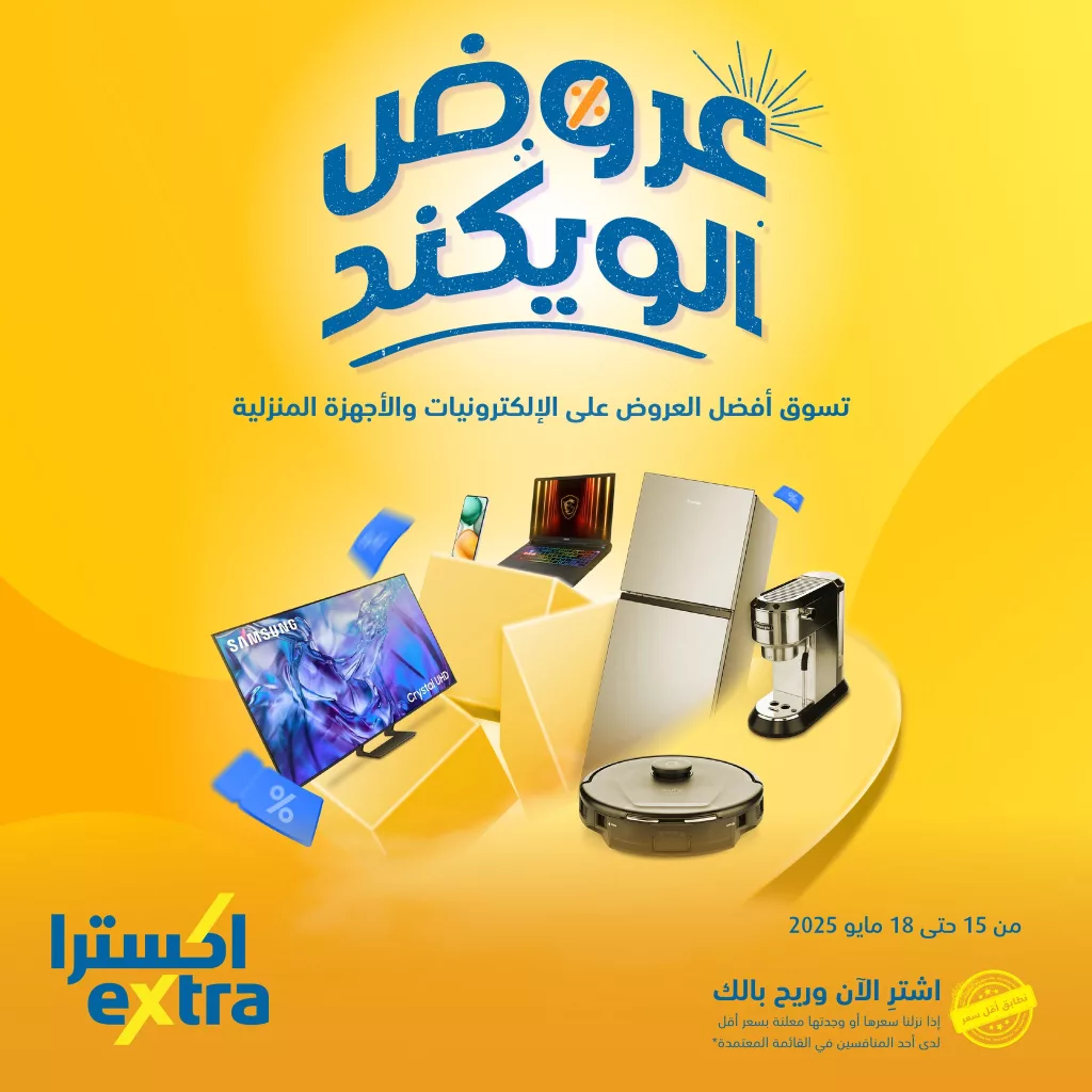 تعتبر عروض الأجهزة المنزلية والإلكترونيات في السعودية من أبرز الفرص التي ينتظرها المستهلكون للحصول على أفضل الأسعار والتخفيضات، خاصة مع اقتراب فصل الصيف الذي يشهد ارتفاعاً في الطلب على التكييفات والثلاجات والغسالات. ومن بين أبرز العروض في هذا الموسم، تأتي عروض الويكند من إكسترا التي تنطلق من 15 مايو وحتى 18 مايو 2025، والتي تشمل مجموعة مميزة من الأجهزة بأسعار مغرية