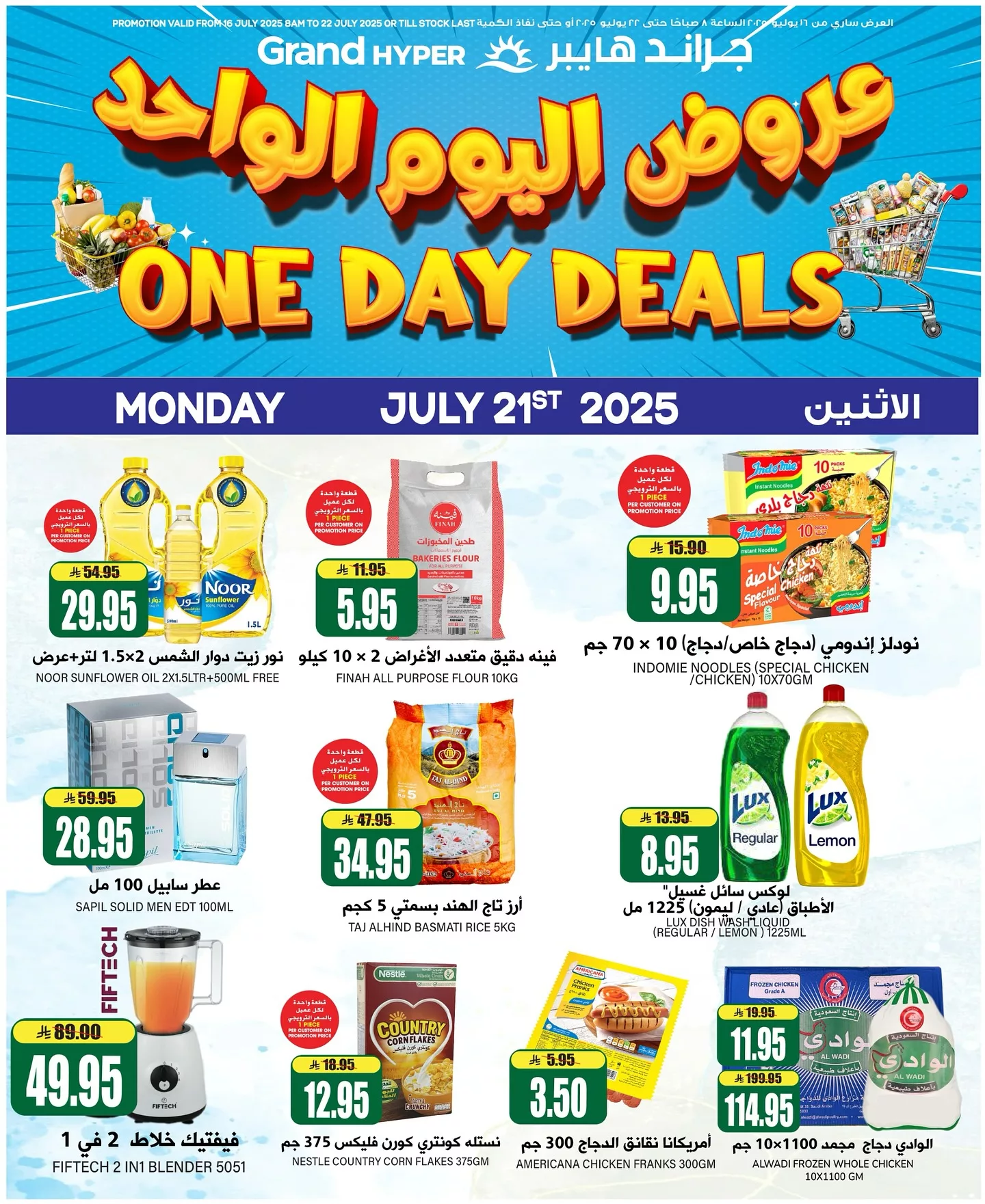 عروض جراند هايبر الرياض الاثنين 21 يوليو 2025 تقدم تشكيلة مختارة من المنتجات الأساسية التي يحتاجها كل بيت بداية من زيت دوار الشمس والحبوب الأساسية مثل الأرز والدقيق إضافة إلى نودلز إندومي الشهيرة التي تعتبر خياراً سريعاً ولذيذاً للوجبات اليومية