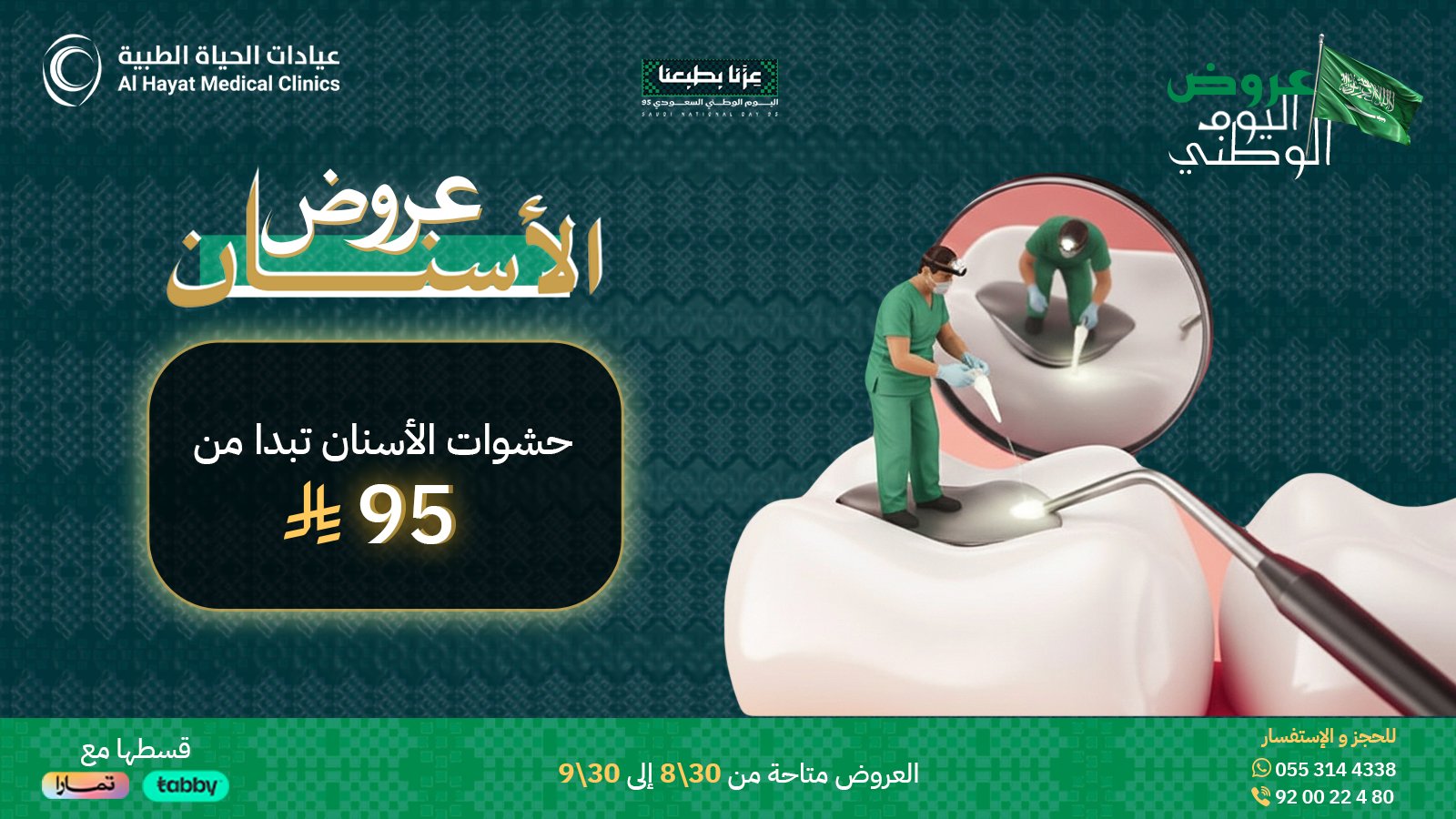 احتفالا بـ اليوم الوطني السعودي، أطلقت مجمع عيادات الحياة الطبية عروضًا مميزة على خدمات الأسنان، حيث توفر أسعارًا تنافسية وخدمات متميزة تلبي احتياجات الجميع. هذه العروض ضمن حرص العيادات على تقديم أفضل الحلول الطبية لراحة المراجعين، حيث يتميز العرض بأسعاره المناسبة وجودة الخدمات المقدمة من نخبة من الأطباء المتخصصين في طب الأسنان