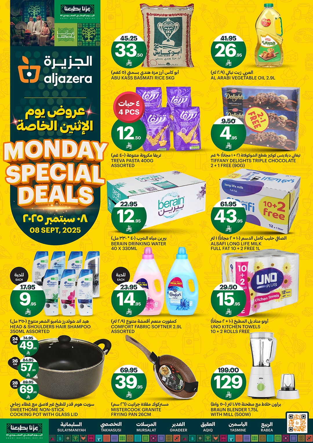 عروض أسواق الجزيرة الاثنين 8 سبتمبر 2025 تشمل تشكيلة واسعة من المنتجات الاستهلاكية من الأرز والزيوت والمكرونة والمياه المعدنية والحليب طويل الأجل إضافة إلى مجموعة من المنتجات الخاصة بالعناية الشخصية والمنظفات وأدوات المطبخ الحديثة و تمتد أيضا لتشمل قسم الطازج حيث تتنوع بين الفواكه والخضروات