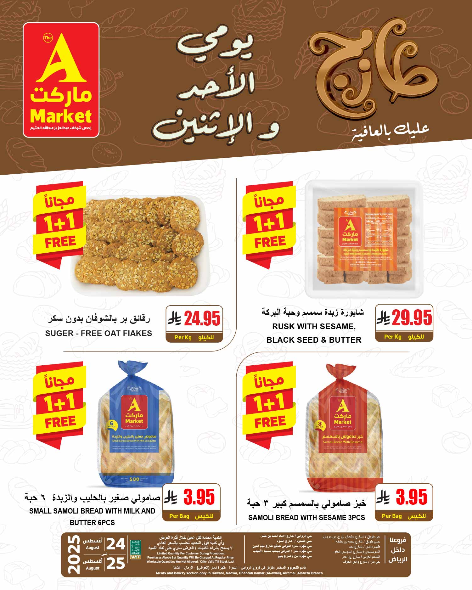 عروض إيه ماركت الرياض الأحد 24 أغسطس 2025 تقدم مجموعة مميزة من اللحوم الطازجة بعناية وجودة عالية حيث تشمل اللحوم الحمراء مثل لحم الغنم البربري والعجل البلدي الخالي من العظم إضافة إلى تشكيلة خضروات وفواكه طازجة مع عروض 1+1 مجانا مثل البطاطس والبقدونس والليمون الفيتنامي والثوم الشبكي