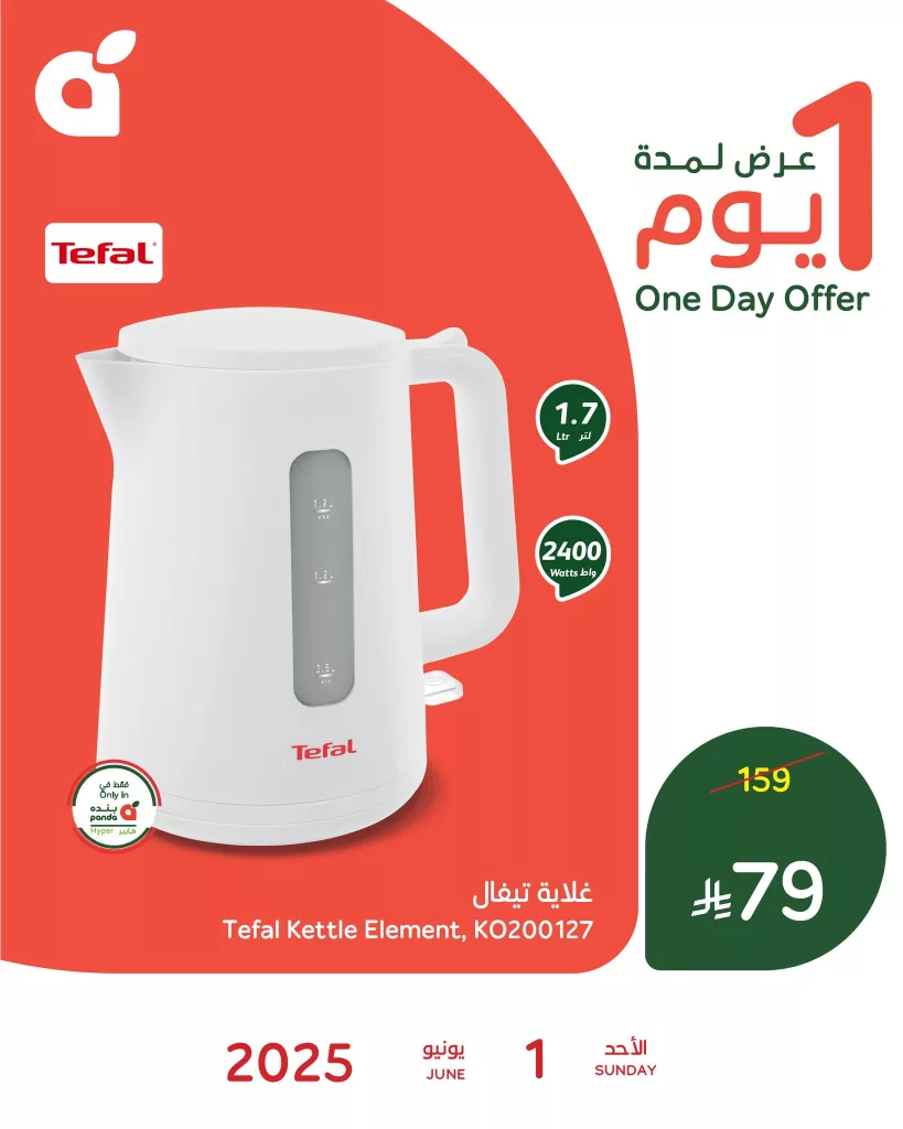 عروض بنده الأحد 1 يونيو 2025 تقدم تخفيضات قوية على الأجهزة المنزلية لتسهل عليك الاختيار وتوفر في ميزانيتك منها غلاية تيفال بسعة كبيرة وتصميم أنيق مثالي للاستخدام اليومي بقوة عالية تساعد في تسخين الماء بسرعة مما يجعلها خيارا عمليا لكل منزل العرض متاح ليوم واحد فقط ضمن تشكيلة مختارة من العروض الحصرية