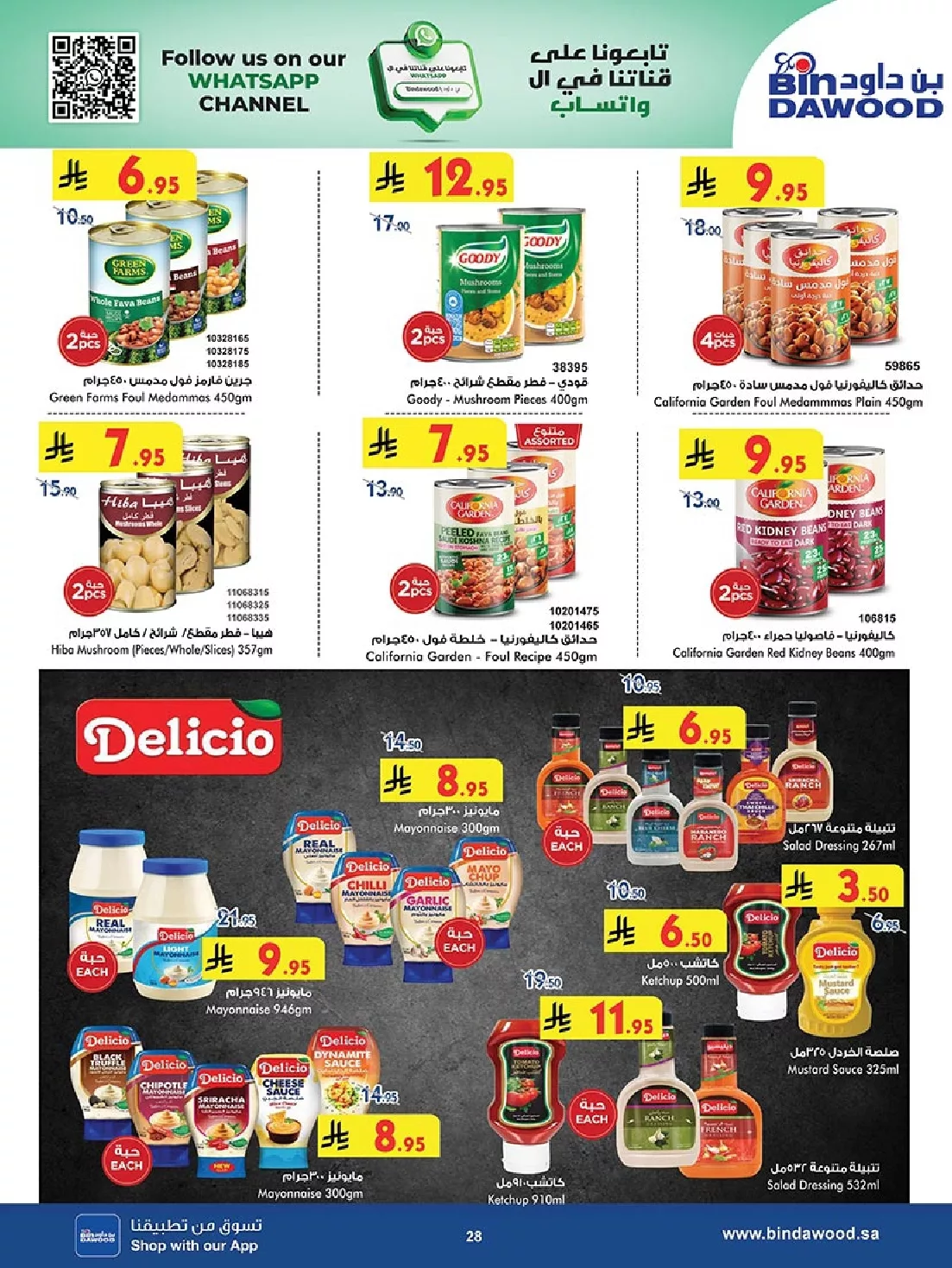 عروض بن داود خميس مشيط الأسبوعية الأربعاء 8-12-1446هـ تقدم باقة من المنتجات الغذائية التي تشمل المعلبات الشرقية مثل الفول والطعمية الجاهزة والمعلبات الغربية مثل الفطر والذرة وصلصات المعكرونة واللبن بنكهات الفواكه والمشروبات الغازية بنكهات الرمان والتفاح الأخضر والعصائر الطازجة