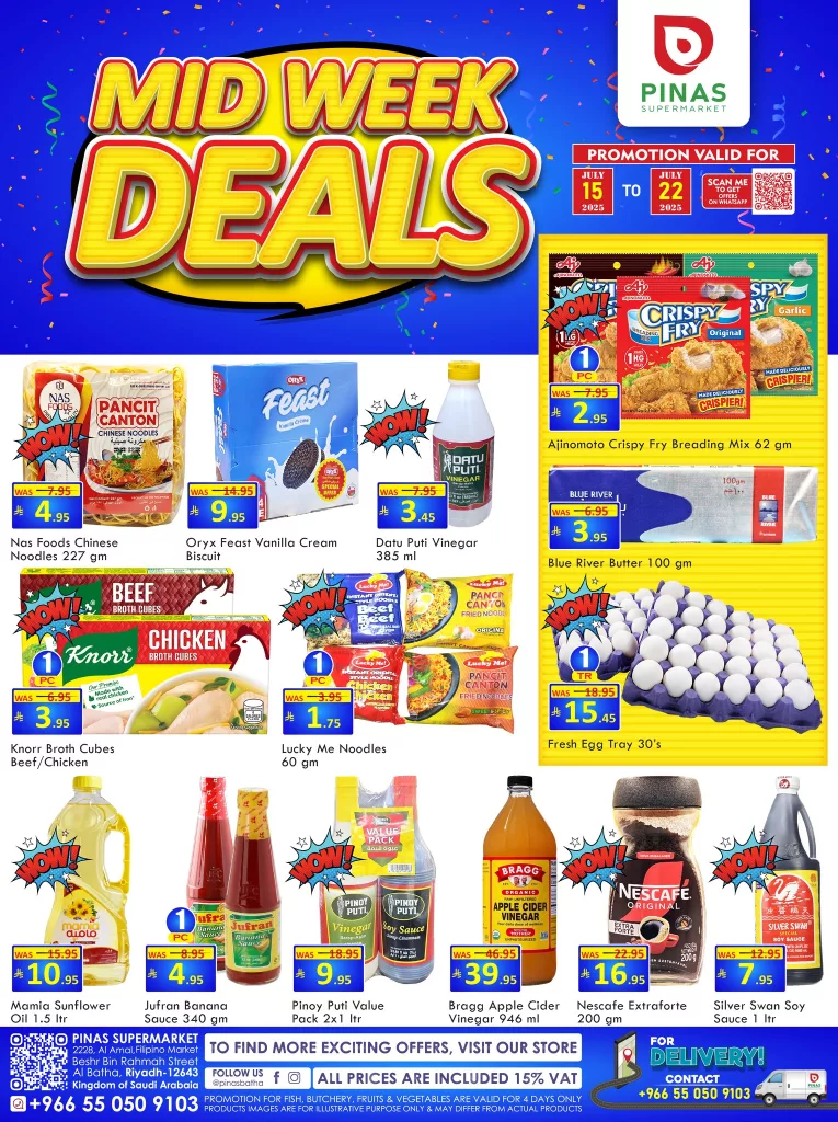 تقدم بيناس هايبر ماركت في الرياض هذا الأسبوع تشكيلة مذهلة من المنتجات الغذائية الأساسية التي يحتاجها كل بيت من الزيوت والمعكرونة والبيض إلى النودلز والصلصات وكلها بتخفيضات مغرية وعروض 1+1 مجانية كما تشمل العروض منتجات يومية مثل الحليب والزبدة والخل