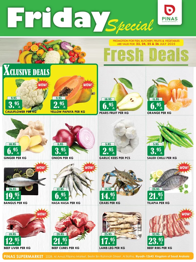 عروض بيناس الرياض الجمعة 29 يوليو 2025 تشمل تشكيلة مميزة من الخضروات الطازجة مثل القرنبيط والبصل الأحمر والفلفل الحار السعودي بالإضافة إلى الفواكه مثل البابايا الصفراء والكمثرى والبرتقال و ايضاا تضم مجموعة من متنوعة من اللحوم الطازجة و باقل الاسعار التي تناسب الجميع