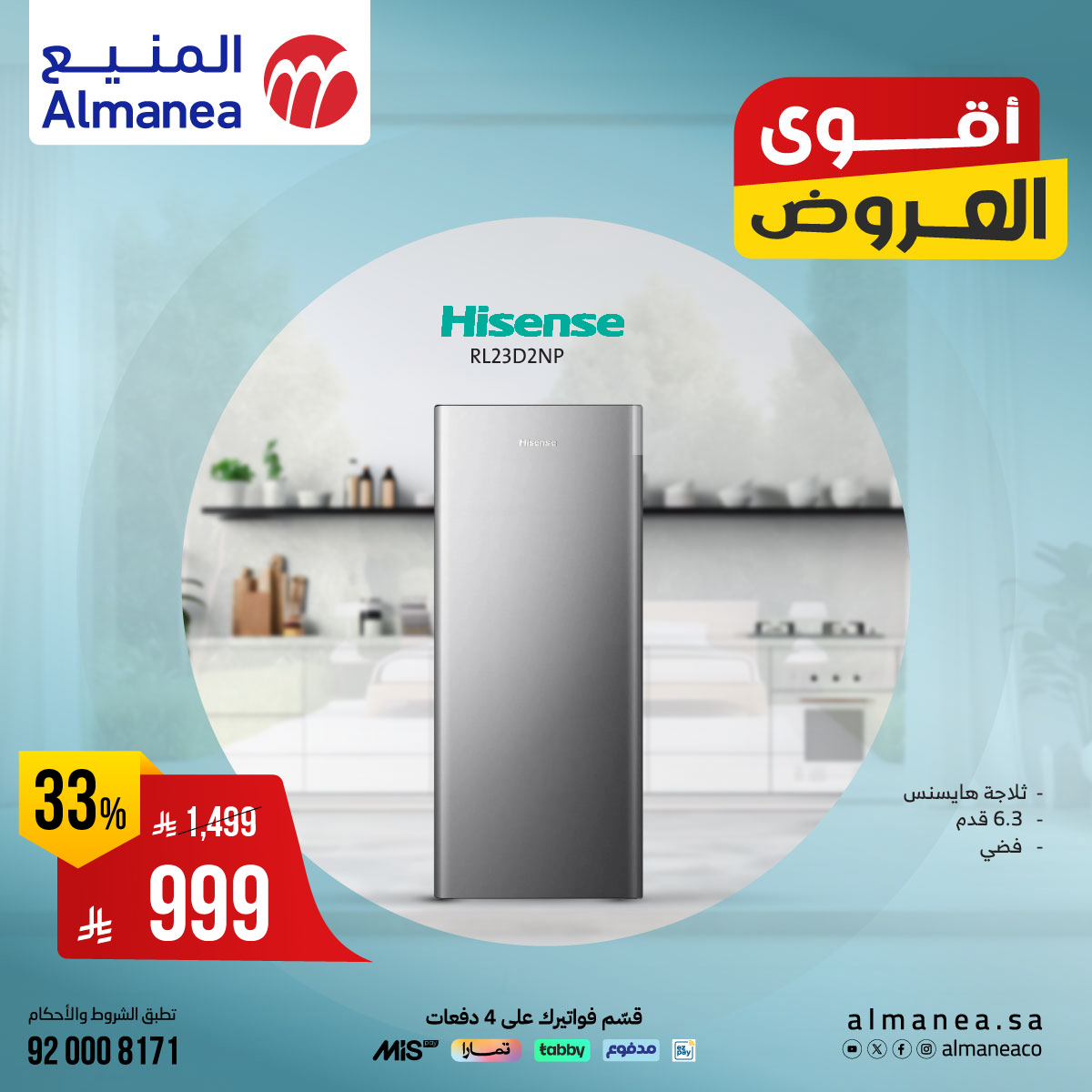 - ثلاجة هايسنس 6.3 قدم – فضي – 999 ريال