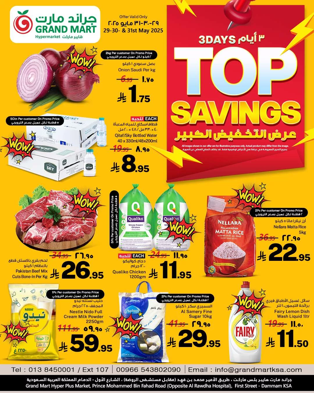 عروض جراند مارت الدمام الخميس 29 مايو 2025 تشمل تشكيلة واسعة من المنتجات الطازجة مثل الخضروات والفواكه واللحوم مما يجعلها وجهة مثالية للتسوق الأسبوعي حيث توفر خيارات متنوعة تلبي احتياجات العائلات من المواد الأساسية اليومية بالإضافة إلى تخفيضات مميزة على الزيوت والأرز والمعلبات