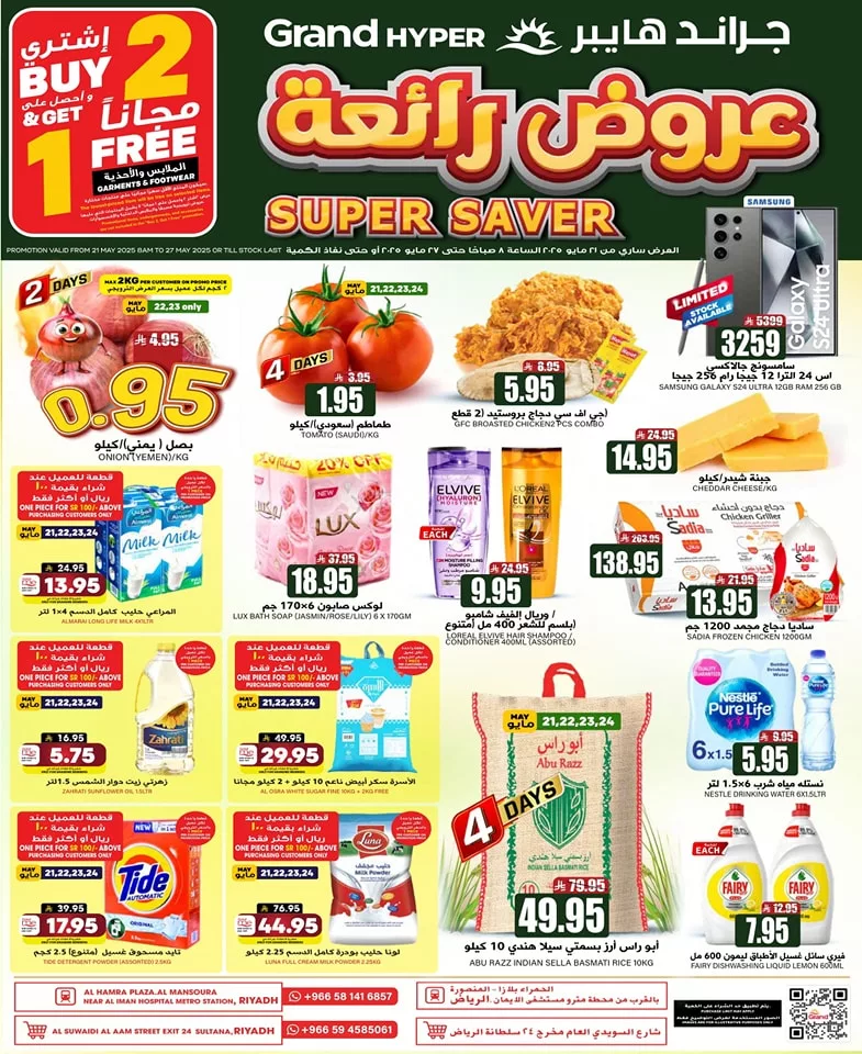 عروض جراند هايبر الرياض الأسبوعية الأربعاء 21 مايو 2025 تقدم تخفيضات مميزة على الفواكه الموسمية مثل البرتقال والعنب والكيوي والخضروات الطازجة مثل السبانخ والطماطم والفلفل بالإضافة إلى عروض على الزبادي بنكهات مختلفة والحليب طويل الأجل والمعلبات المتنوعة مثل الحمص والفطر وصلصة الطماطم