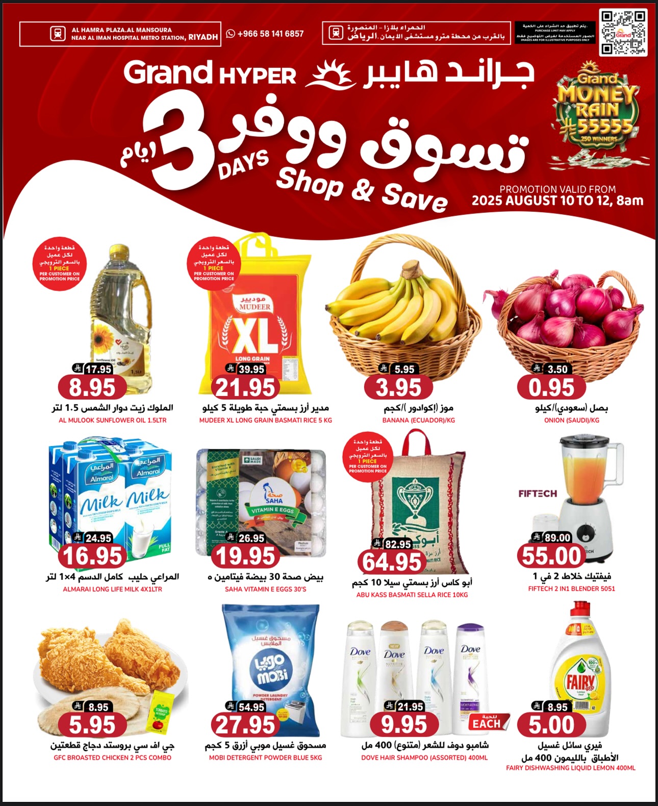 عروض جراند هايبر الرياض الاحد 10 اغسطس 2025 تقدم تشكيلة متنوعة من المنتجات الغذائية والاستهلاكية من الزيوت والأرز والحليب والبيض إلى الفواكه الطازجة والخضروات و تشمل أيضا مجموعة مميزة من اللحوم والدواجن الطازجة التي تم اختيارها من أفضل المصادر لتوفير طعم لذيذ وقيمة غذائية عالية بالإضافة إلى الفواكه الموسمية