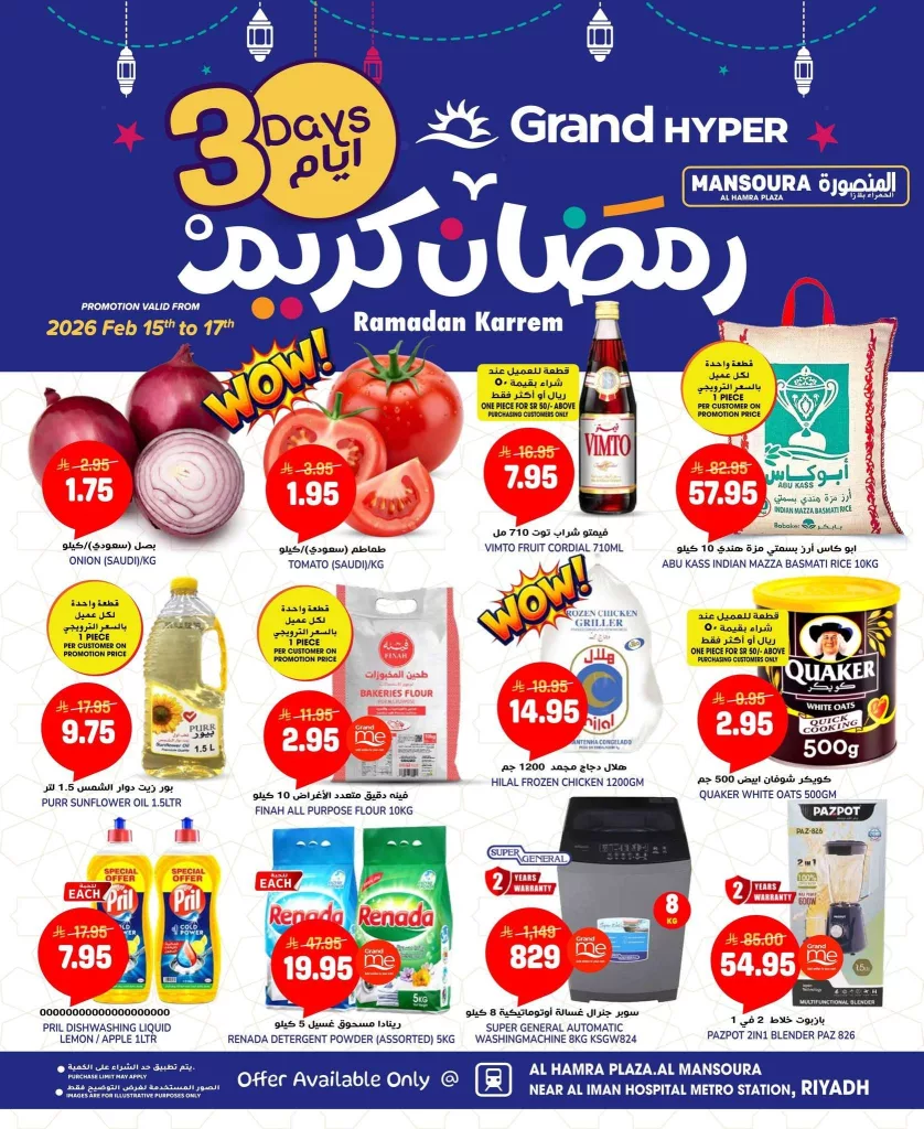 كما تشمل عروض جراند هايبر الرياض اليوم علي الخضروات والفواكه الأساسية والمواد التموينية كالأرز والزيت والدقيق ومستلزمات التنظيف والأجهزة المنزلية بالإضافة إلى المخبوزات والحلويات الرمضانية