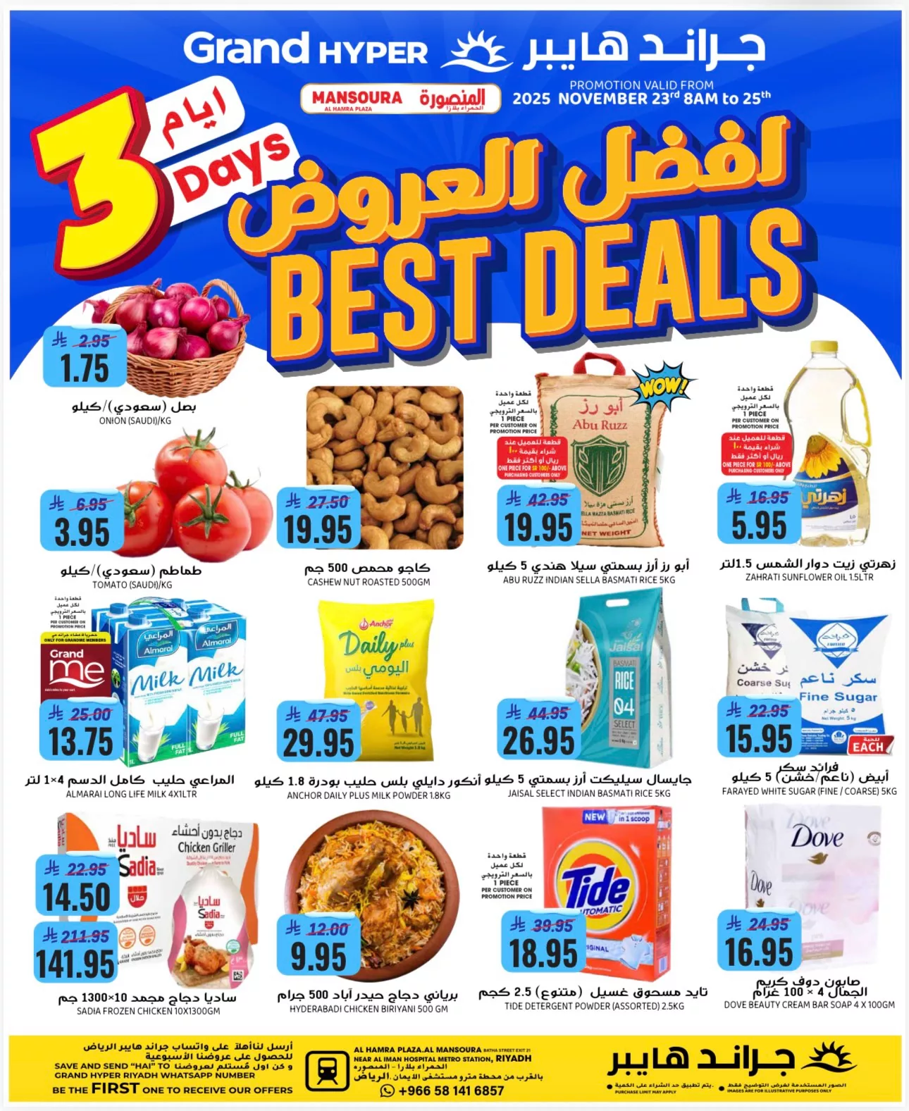 بنقدم ليكم عروض جراند هايبر الرياض الاحد 2 جماد الاخر 1447هـ و تحتوي علي الخضروات والفواكه مثل التفاح الأحمر والموز الإكوادوري والرمان اليمني بالإضافة إلى الخضروات المحلية مثل الباذنجان والقرع السعودي و بتوفر كمان لزيوت النباتية مثل زيت دوار الشمس وزيت الذرة بالإضافة إلى المعلبات والتونة الخفيفة والفواكه المستوردة