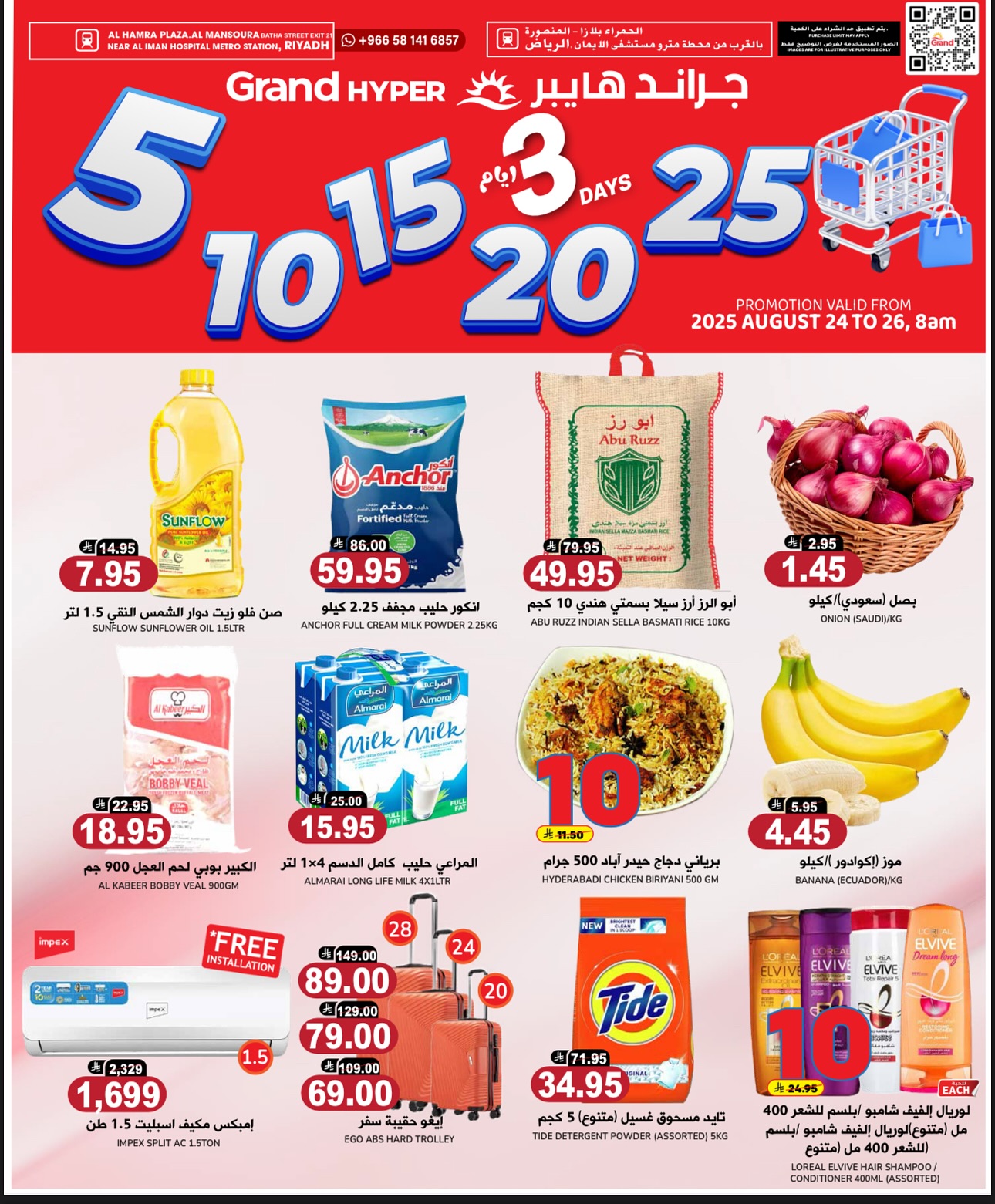 تشمل عروض جراند هايبر الرياض الاحد 23-8-2025 مجموعة كبيرة من المنتجات الغذائية الأساسية مثل الزيوت النباتية وزيت الزيتون وعبوات الحليب والأرز البسمتي والسكر والطحين إلى جانب الخضروات والفواكه مثل البصل والموز و تشمل الأجهزة المنزلية مثل الميكروويف والغسالات والمراوح والمكاوي وسخانات الطعام