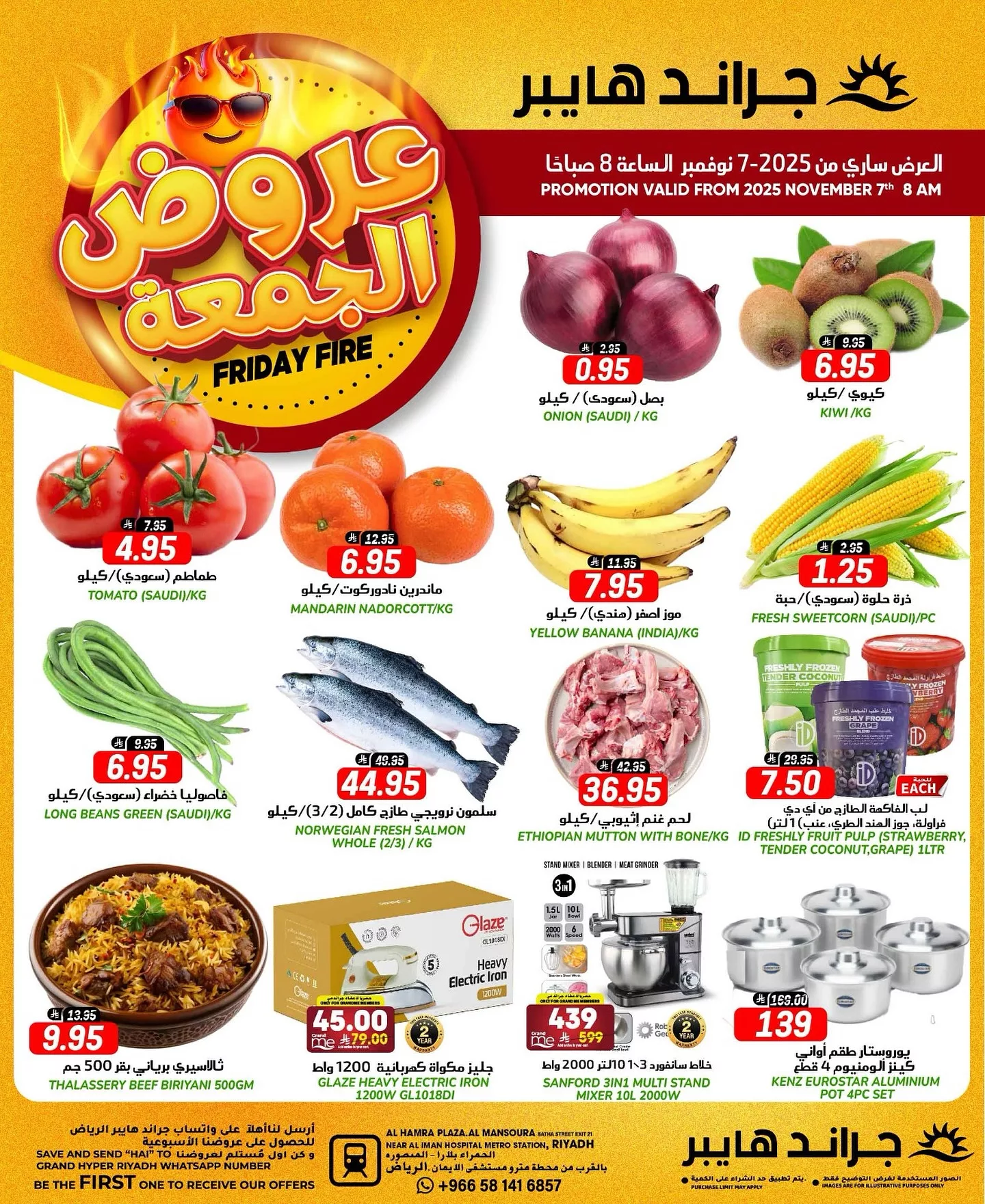 بنقدم لكم اليوم احدث عروض جراند هايبر الرياض الجمعة 7-11-2025 و تحتوي علي البصل والطماطم والكيوي والموز الهندي والذرة والفاصوليا الخضراء بالإضافة إلى سمك السلمون النرويجي واللحوم المتنوعة تشمل أيضا أجهزة منزلية مثل المكاوي الكهربائية القوية والخلاطات وأطقم الطهي الأوروبية وغيرها من المنتجات باقل الاسعار