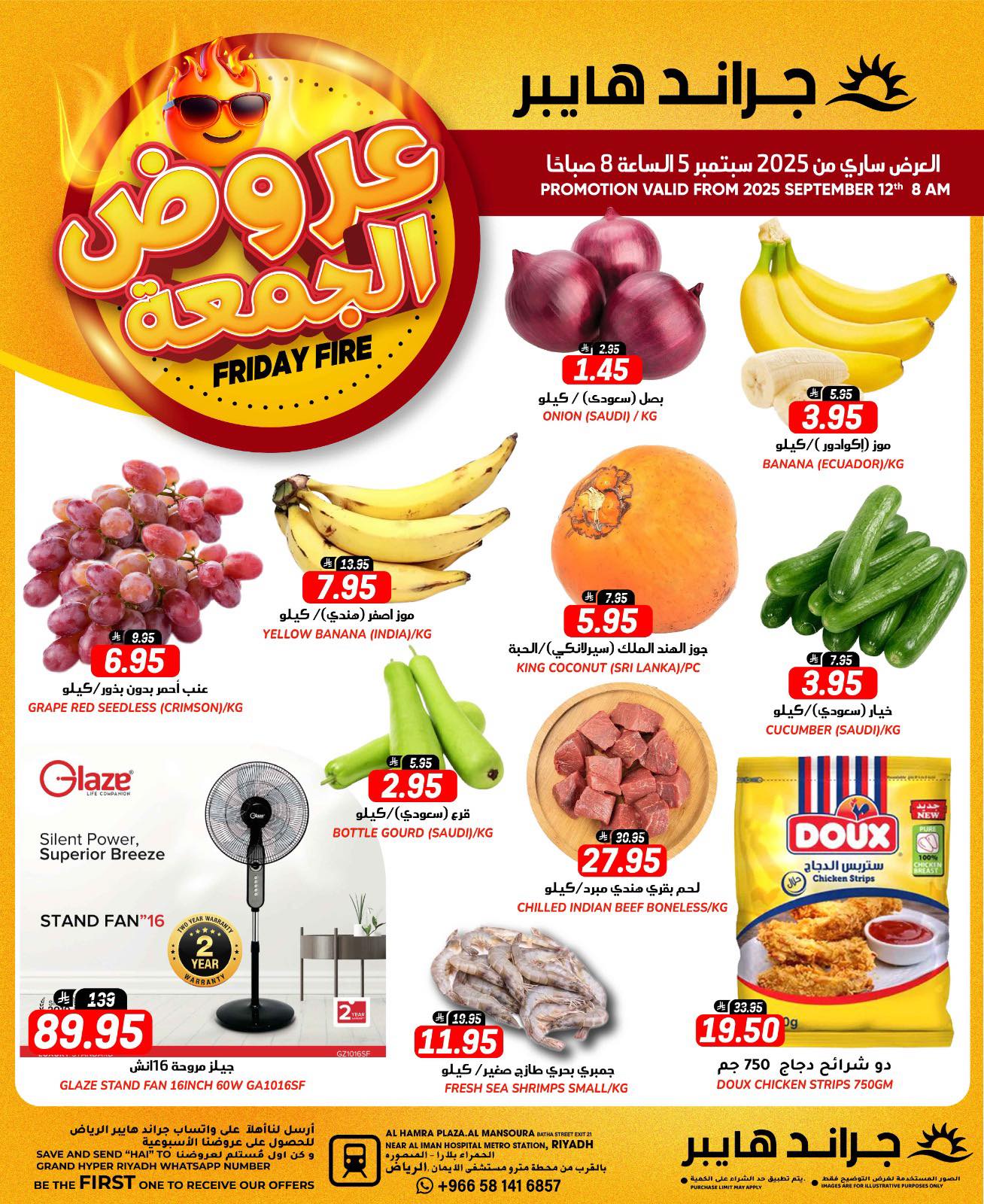 عروض جراند هايبر الرياض الجمعة 12 سبتمبر 2025 تشمل مجموعة واسعة من المنتجات الطازجة من الخضار والفواكه مثل البصل والخيار والقرع الأخضر والموز بأنواعه إضافة إلى العنب الأحمر وجوز الهند الطازج و تشمل أيضا خيارات متنوعة من اللحوم الطازجة والجمبري البحري والدجاج المجمد المقرمش إلى جانب الأجهزة المنزلية