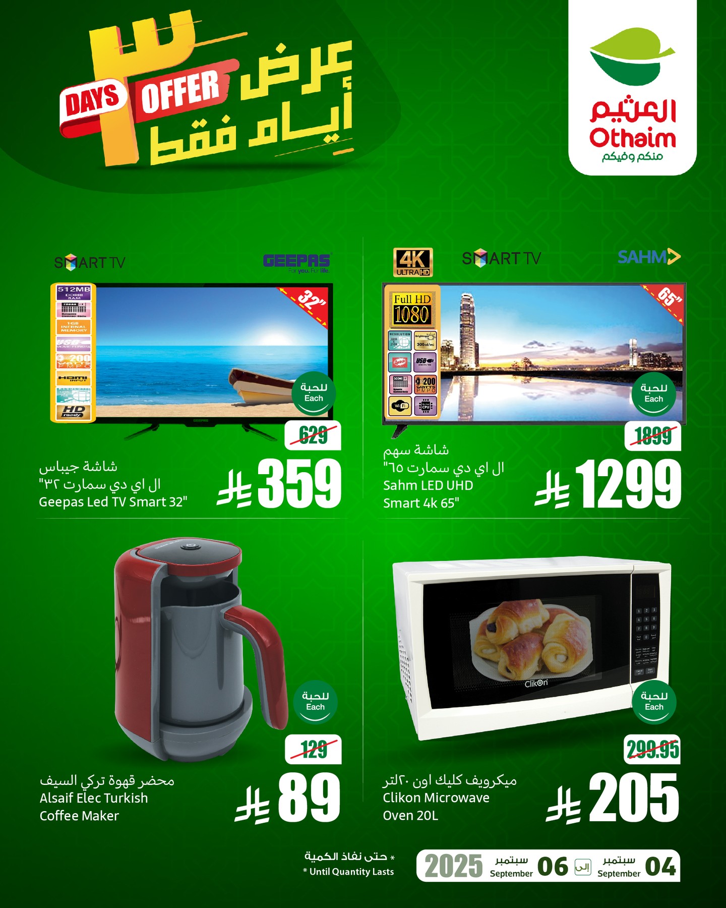 نقدم لكم اليوم عروض العثيم السبت 6 سبتمبر 2025 و تقدم مجموعة متنوعة من الأجهزة الكهربائية المميزة مثل مكواة فيليبس الجاف ومكواة كيـون بخار بالإضافة إلى خلاط كيـون العصري ومحضر القهوة التركي من السيف و تشمل كذلك منتجات كبرى من الإلكترونيات وأدوات الطهي مثل شاشة جيباس ليد 32 بوصة وشاشة سهم UHD سمارت 65