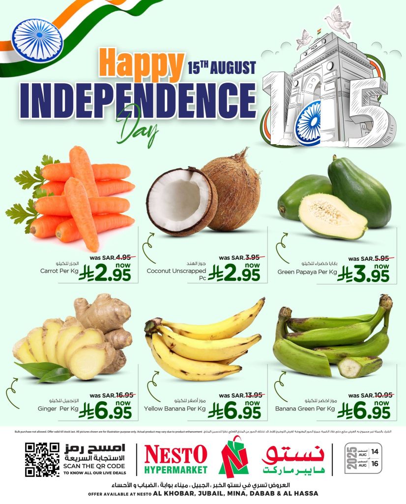 عروض نستو الدمام الجمعة 15 اغسطس 2025 تقدم باقة مميزة من المنتجات الأساسية الأرز البسمتي الفاخر وزيت جوز الهند ودقيق القمح والسمن النقي بالإضافة إلى الشاي والحلويات الهندية والبقوليات و تشمل تشكيلة متنوعة من الخضار والفواكه الطازجة مثل الجزر والزنجبيل والموز والبابايا بجانب الكركم الطازج واليام الهندي