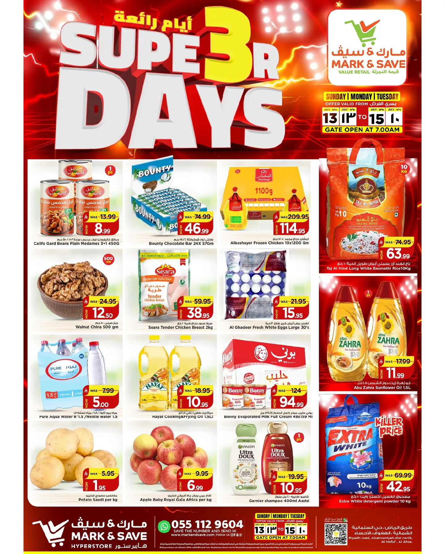 تشهد عروض الهايبر ماركت في السعودية تنوعاً كبيراً وتنافساً حاداً بين المتاجر لتقديم أفضل التخفيضات على المواد الغذائية والمنزلية، ويأتي عرض مارك وسيف – عروض 3 أيام رائعة ليؤكد هذا التوجه بطرح عروض مميزة تبدأ من يوم الأحد 13 يوليو 2025 وحتى الثلاثاء 15 يوليو 2025، حيث تفتح الأبواب يومياً من الساعة 7 صباحاً